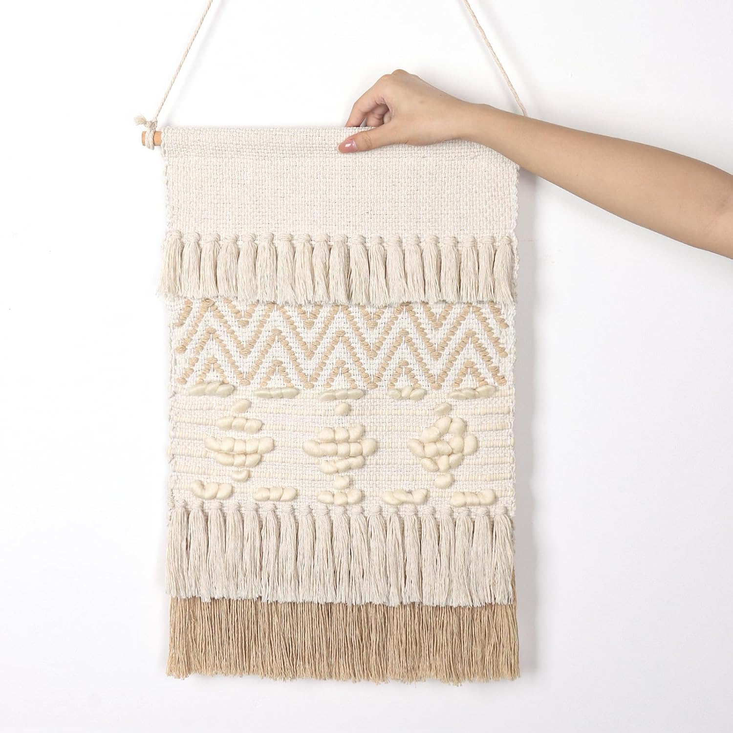 - 【Size&Detail】: Approx 15.7" W x22" L (Not including the length of hanging rope, the hanging rope can be adjusted). Packaging Included A Macrame Wall Hanging + Two non-trace nails + A hemp rope + A wooden Stick.