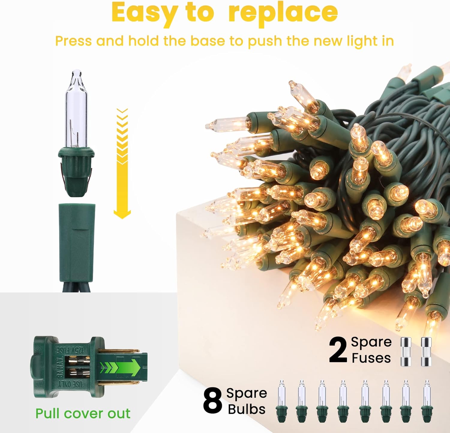 - 🎄 Specification & Quality Customer Service: 300 count mini bulbs, 75ft long green wire, the length between 2 bulbs: 3inch. Come with 8 spare bulbs and 2 spare fuses. Toodour provides 30-day money-back and 12-month replacements. If you have any questions, please feel free to contact us.