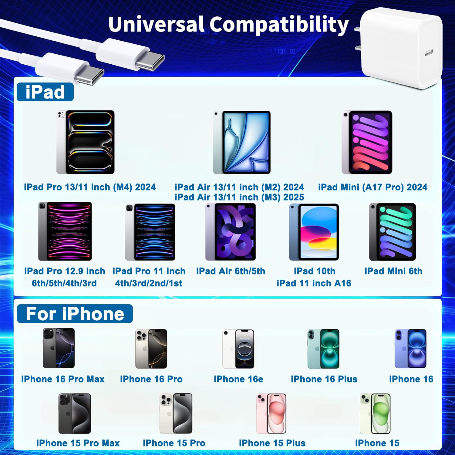 - 【USB C Charger for iPad/iPhone 16 15】Use this 20W USB C wall charger with 10FT Long charger cord MFi certified to access the fast charging for 2025 iPad Air 13/11-in(M3), iPad A16, iPad Mini A17 Pro, New iPad Pro 13/11-in(M4), iPad Air 13/11-in(M2), 2022 iPad 10th Gen, iPad Pro 12.9 in 6th/5th/4th/3rd Gen, iPad Pro 11 in 4th/3rd/2nd/1st Gen, iPad Air 4th/5th Gen, iPad mini 6th;for IPhone 16/16 Plus/16 Pro/16 Pro Max/16e/15/15 Plus/15 Pro/15 Pro Max(NOTE: Not for iPhone 14 and previous versions)