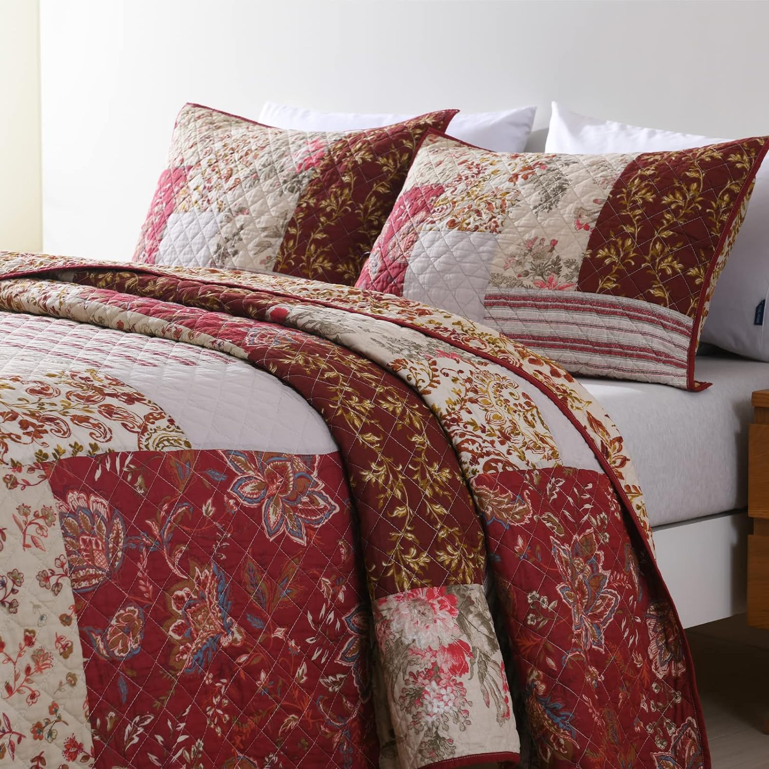 - REVERSIBLE BEAUTIFUL REAL PATCHWORK DESIGN: The real patchwork quilt set is made of different patterns pieces sewn together. The quilt set is reversible design; its A side is designed with floral paisley pattern and its B side with bohemian plaid. The delicate country floral style design fits for any decoration and will brighten your room. It is a great choice to send it to your families and friends.