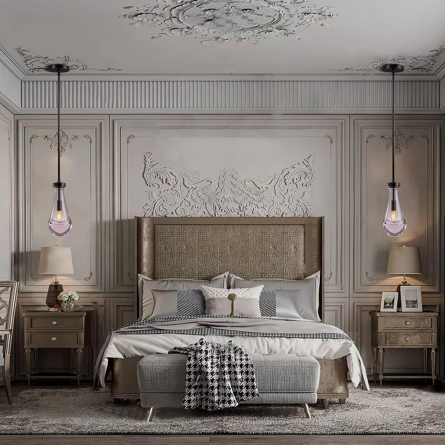 - 【Thickened Material】All the external metal parts of this pendant lights kitchen island are made of copper, which makes this kitchen light fixtures more textured. The hand-blown glass shade makes each island lights for kitchen a unique presence. The bottom of the raindrop glass shade is thicker, making the light softer.