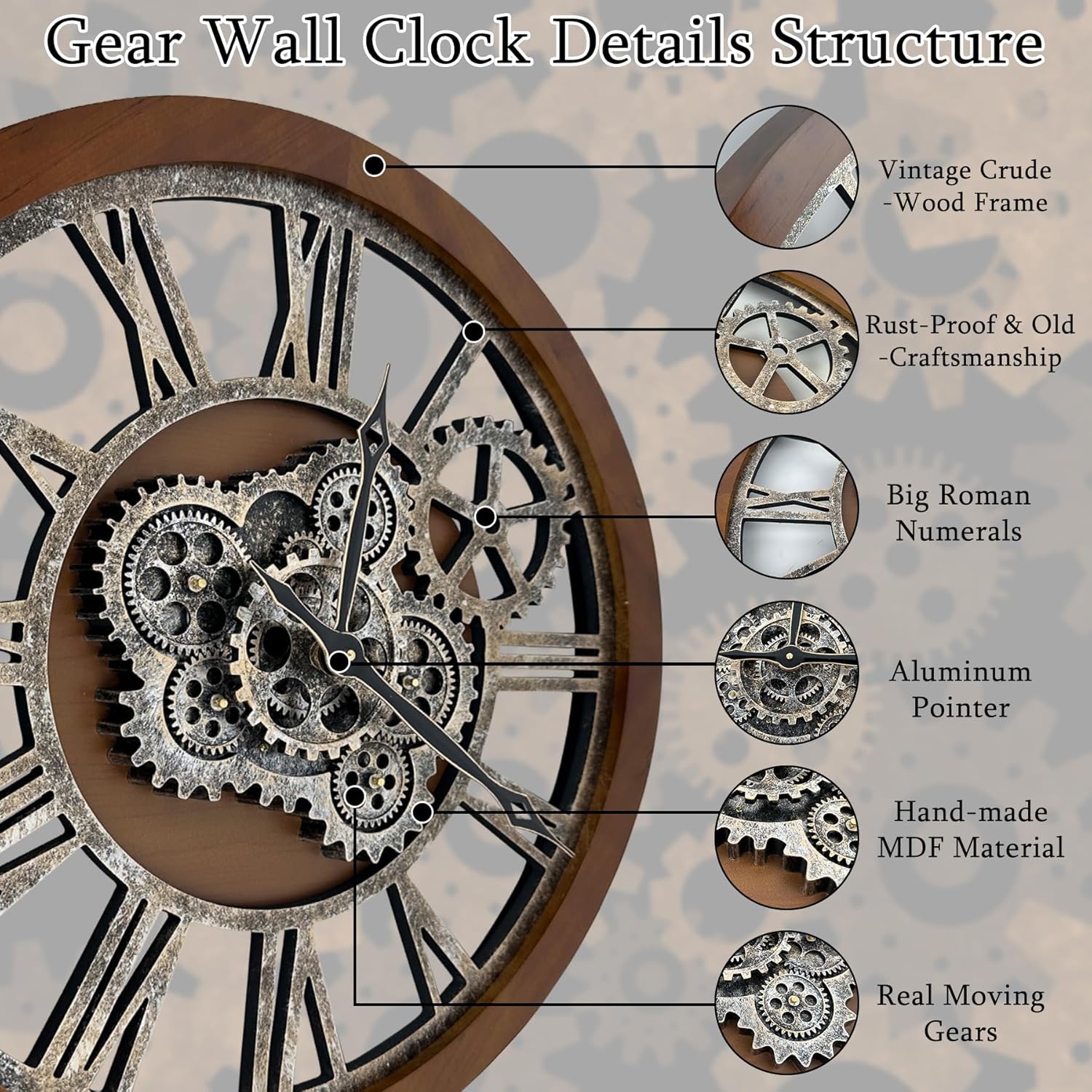 - 【Real Moving Gear Clock】All gears for the wall clock are real moving! Design with rustic bronze-color and industrial style. An creative combination of four gears for a retro look, has a very exquisite decorative effect makes the wall clock become a chic art works. The large wall clock crafted of nature wood & MDF. Big roman numeral numbers and wood rustic moving gears perfect for any room decor.