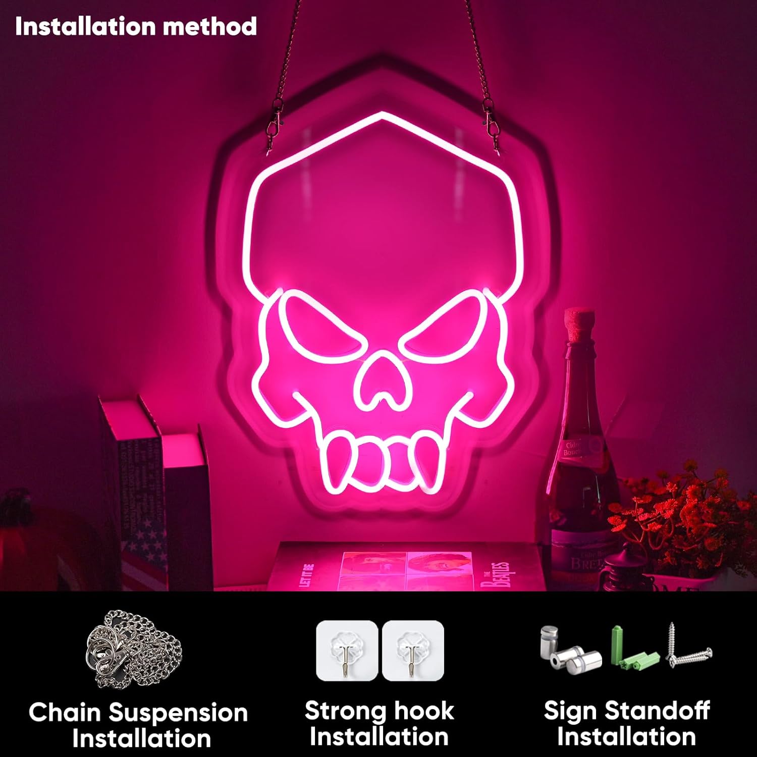 - 【Halloween Skull Neon Sign Decoration】The neon light is in the shape of a skull,pink skull neon sign is made by flexible silicon LED strip lights and fixed on an acrylic clear board