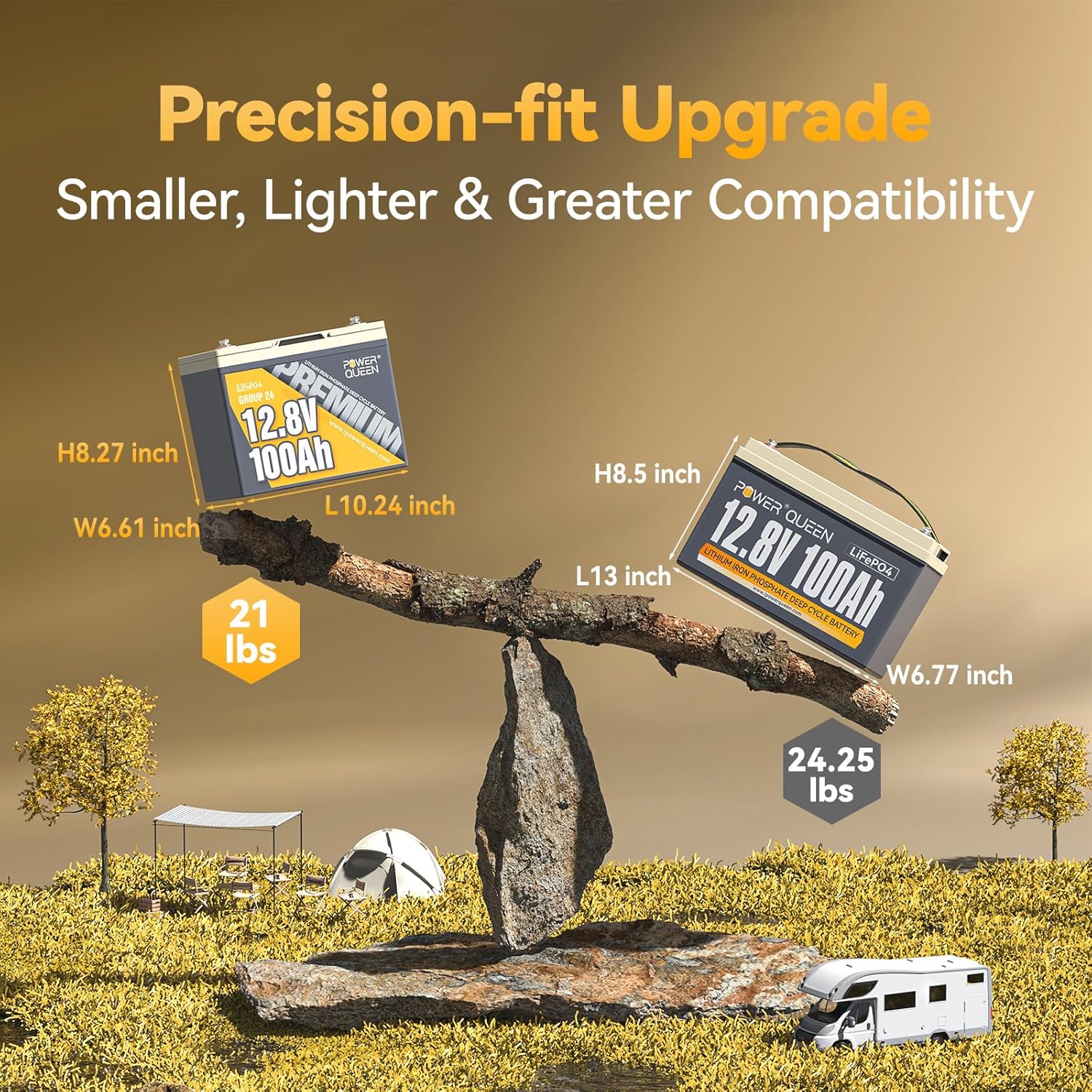 - 【Effortless Upgrade to Group 24 Size】The Power Queen 12V100Ah Premium battery is meticulously crafted to meet the BCI standard minimum size for Group24 batteries. Upgrading from lead-acid to lithium has never been smoother—simply replace your Group24 battery without the hassle of modifying your existing electrical system or wiring. Enjoy a faster and more straightforward transition to superior power.