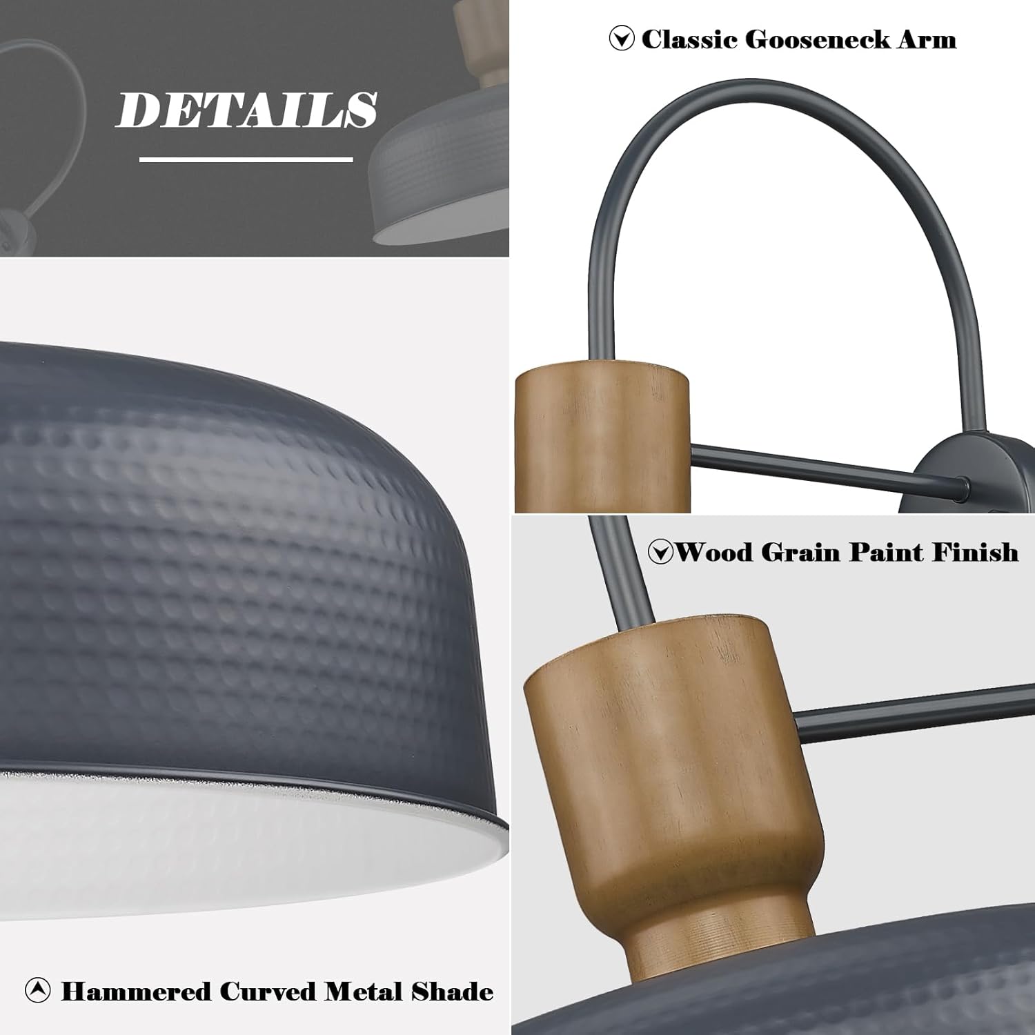 - Hammered Design Wall Sconces : The exterior wall sconce with gooseneck arm, Harmmered metal shade matches with the unique eco-friendly wood grain material,complementing any indoor/outdoor decor.