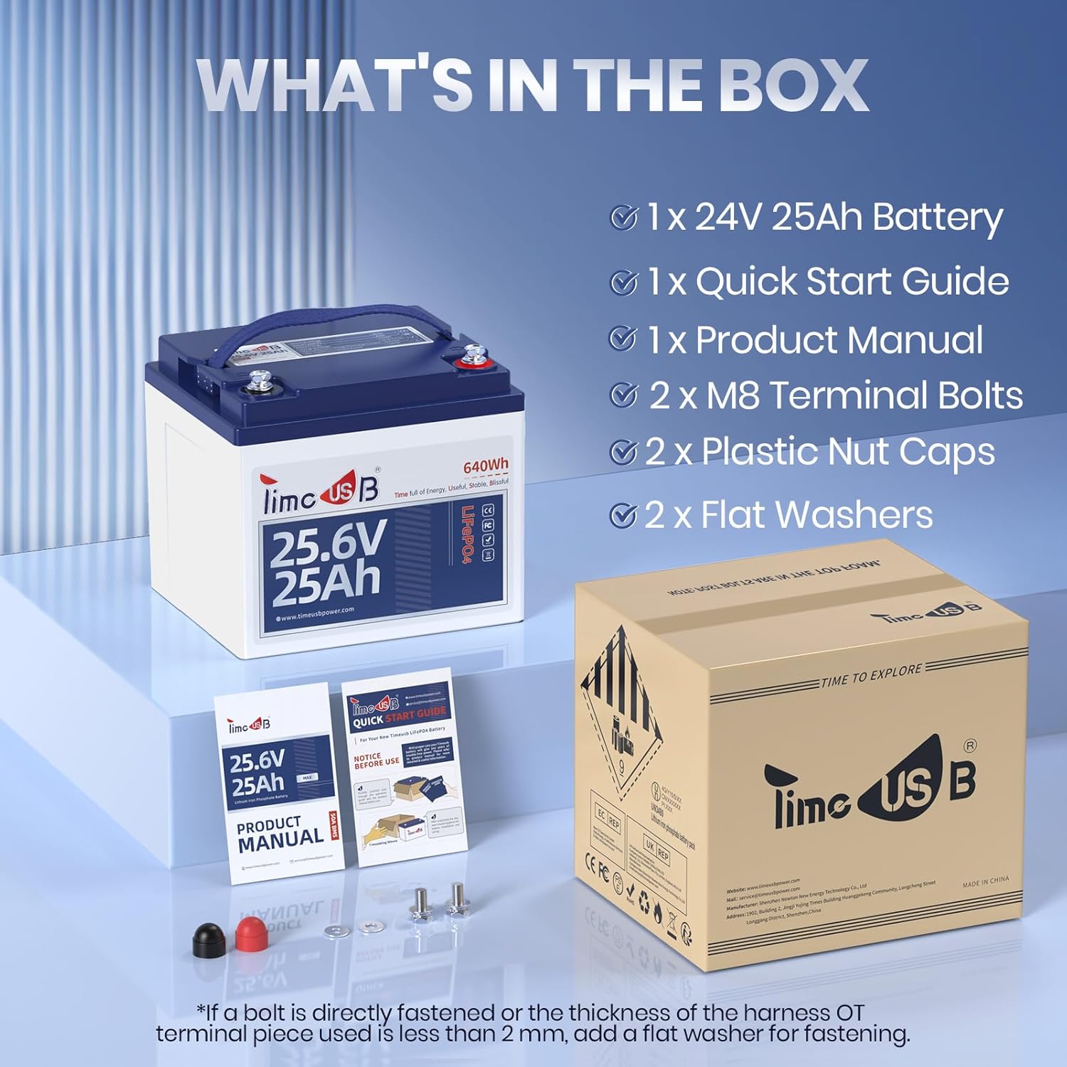 - 【2C High Discharge Rate LiFePO4 Battery Cell】 Timeusb 24V25Ah Lithium Iron Phosphate Battery Built-in 50A BMS board, 2C high-energy discharge, realizing 1280W sustained load power. 24V 25Ah LiFePO4 batteries available in the market release 1C discharge on 25A BMS board, and the load power is only 640W, therefore Timeusb 24V 25Ah LiFePO4 battery offers superior output power performance. Please note that these 2-pack batteries come in 2 packages and may arrive on different days