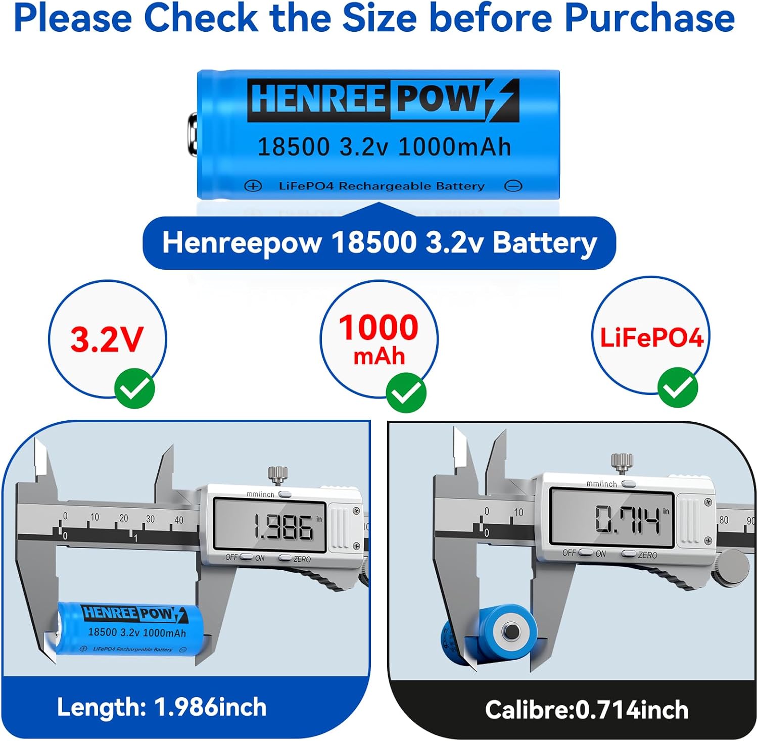 - 【Important NOTE】This is Henreepow high capacity 18500 rechargeable li-ion battery which length is 2 inches and the width is 0.7 inches. Please confirm whether the battery model required by your device is 3.2V 18500 Battery.