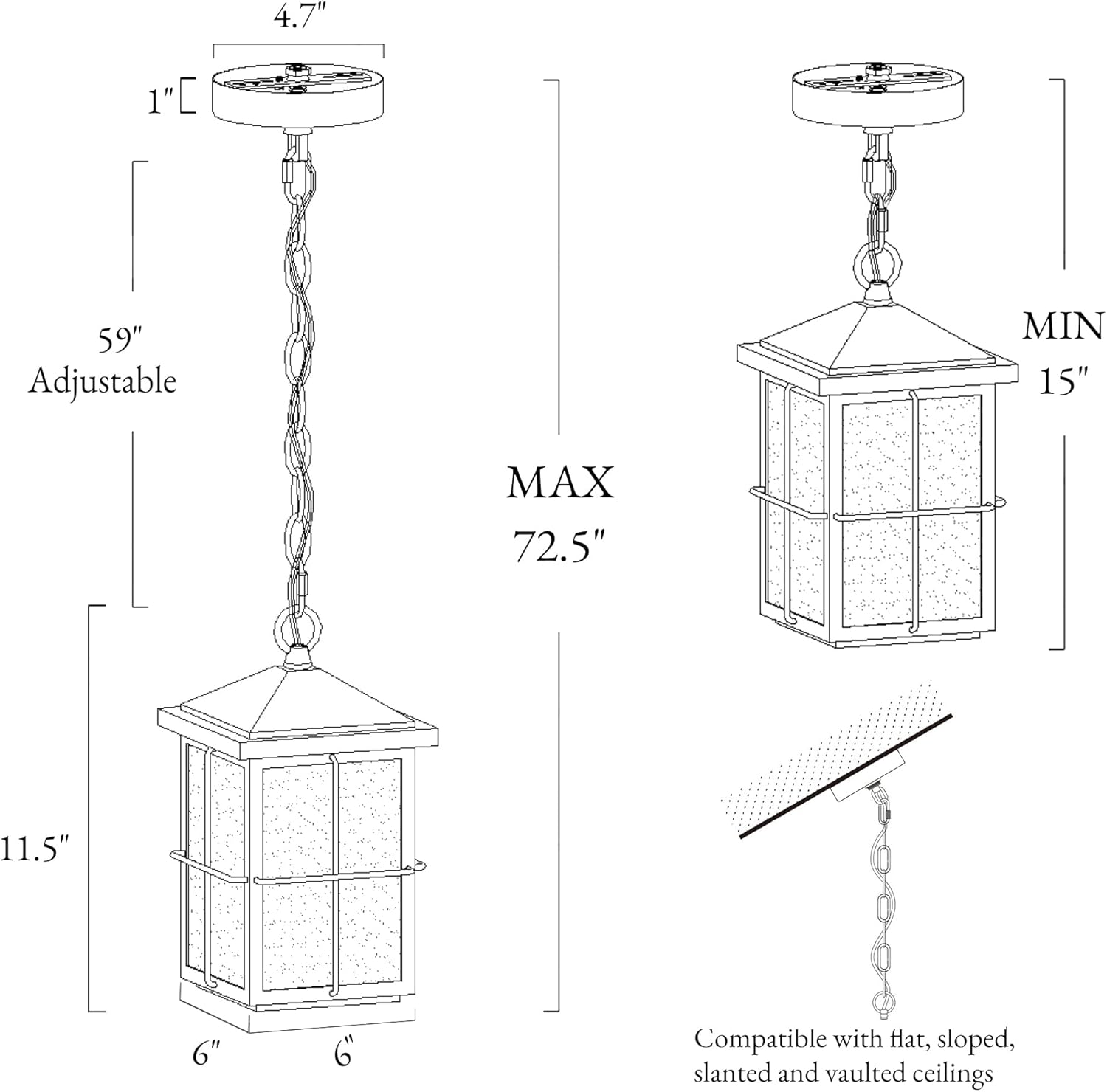 - Ideal Size & Suited Space: The gazebo hanging light size is 6” L x 6” W x 11.5” H.; The canopy size is 4.7" D x 1" H, which can cover the standard junction box. Sloped and vaulted ceilings are compatible. Equipped with a 59" adjustable hanging chain, this outdoor porch light can be hung from Min 13" to Max 72.5". Its classic design adds a sense of modern farmhouse feeling to porches, garages, gazebos, yards, and gardens. It is also suited to indoor places, like the kitchen island or hallway.