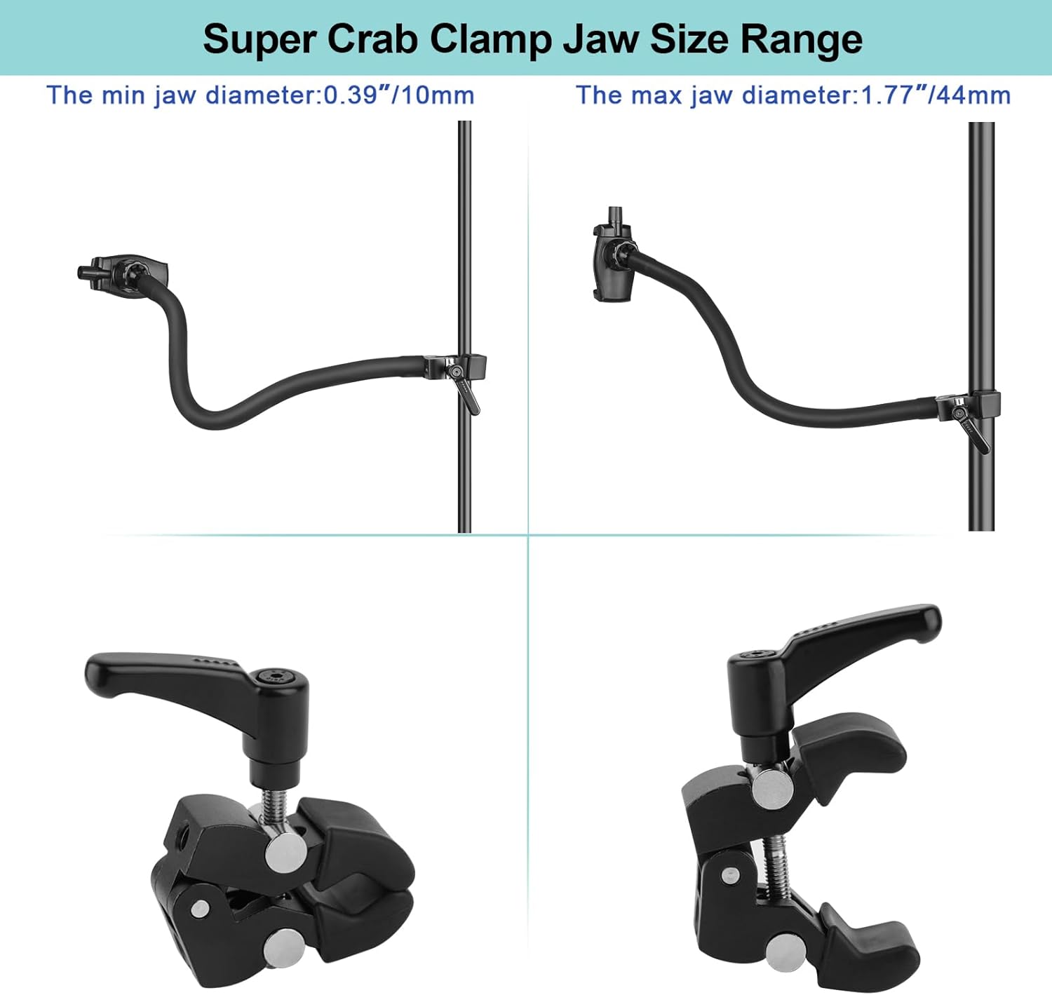 - 【Super Crab Clamp】:Aluminum alloy material construction,solid,anti-rust and anti-corrosion,with 1/4"-20 and 3/8"-16 threads hole,jaw equipped with 2 anti-skid rubbers cases,increased friction, anti-slip,reduced scratching,clamp firmly,more stable and secure.