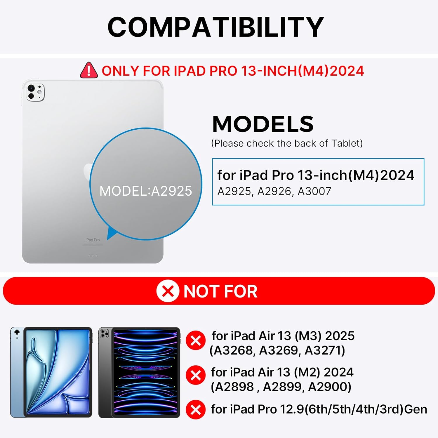 - ๐๐ผ๐บ๐ฝ๐ฎ๐๐ถ๐ฏ๐ถ๐น๐ถ๐๐: Elevate your iPad Pro 13 inch (M4) 2024 experience with our versatile keyboard case. Supported models: A2925,A2926,A3007. Due to the different arrangement of the magnets, this magic keyboard case is Not compatible with other iPad models.If you're unsure about compatibility, feel free to reach outโwe're happy to help!