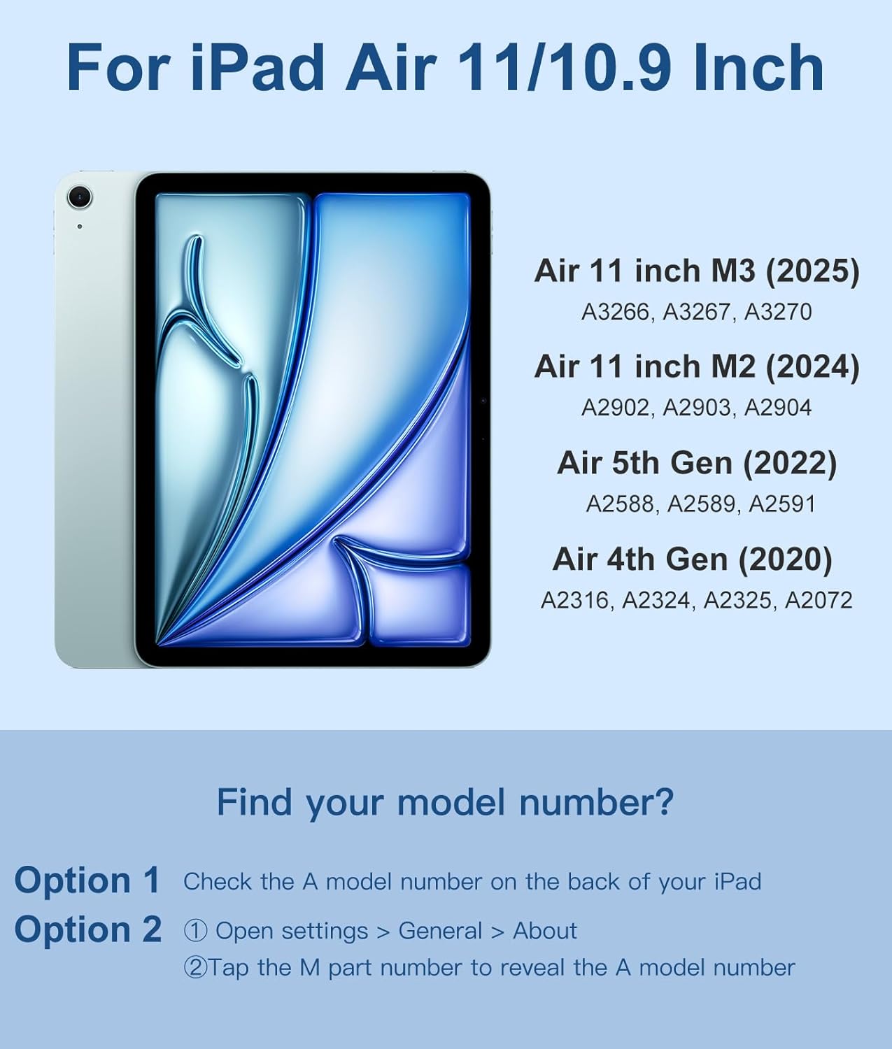 - ❤【Perfect Compatibility】Specially designed Compatible with iPad Air 11-inch (M3) 2025 (Model Number: A3266/A3267/A3270), for iPad Air 11-inch (M2) 2024 (A2902/AA2903/A2904), for Air 5th Generation 2022 (A2588/A2589/A2591), for Air 4th Generation 2020 (A2316/A2324/A2325/A2072), this keyboard case offers precise cutouts for all ports, buttons, and cameras, seamless access to all features without removing it. Please find the No. "AXXXX" of your tablet before order(Open settings > General > About, Tap the M part number to reveal the A model number)