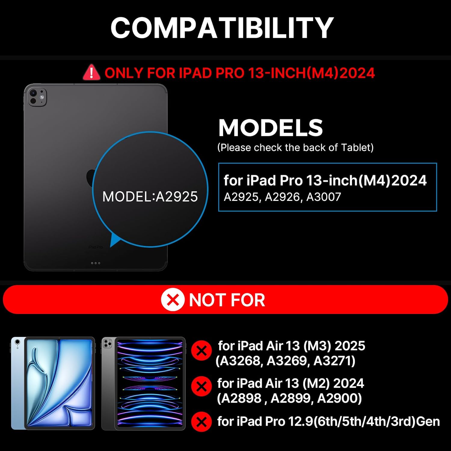 - ๐๐ผ๐บ๐ฝ๐ฎ๐๐ถ๐ฏ๐ถ๐น๐ถ๐๐: Elevate your iPad Pro 13 inch (M4) 2024 experience with our versatile keyboard case. Supported models:A2925,A2926,A3007. Due to the different arrangement of the magnets, this magic keyboard case is Not compatible with other iPad models.If you're unsure about compatibility, feel free to reach outโwe're happy to help!