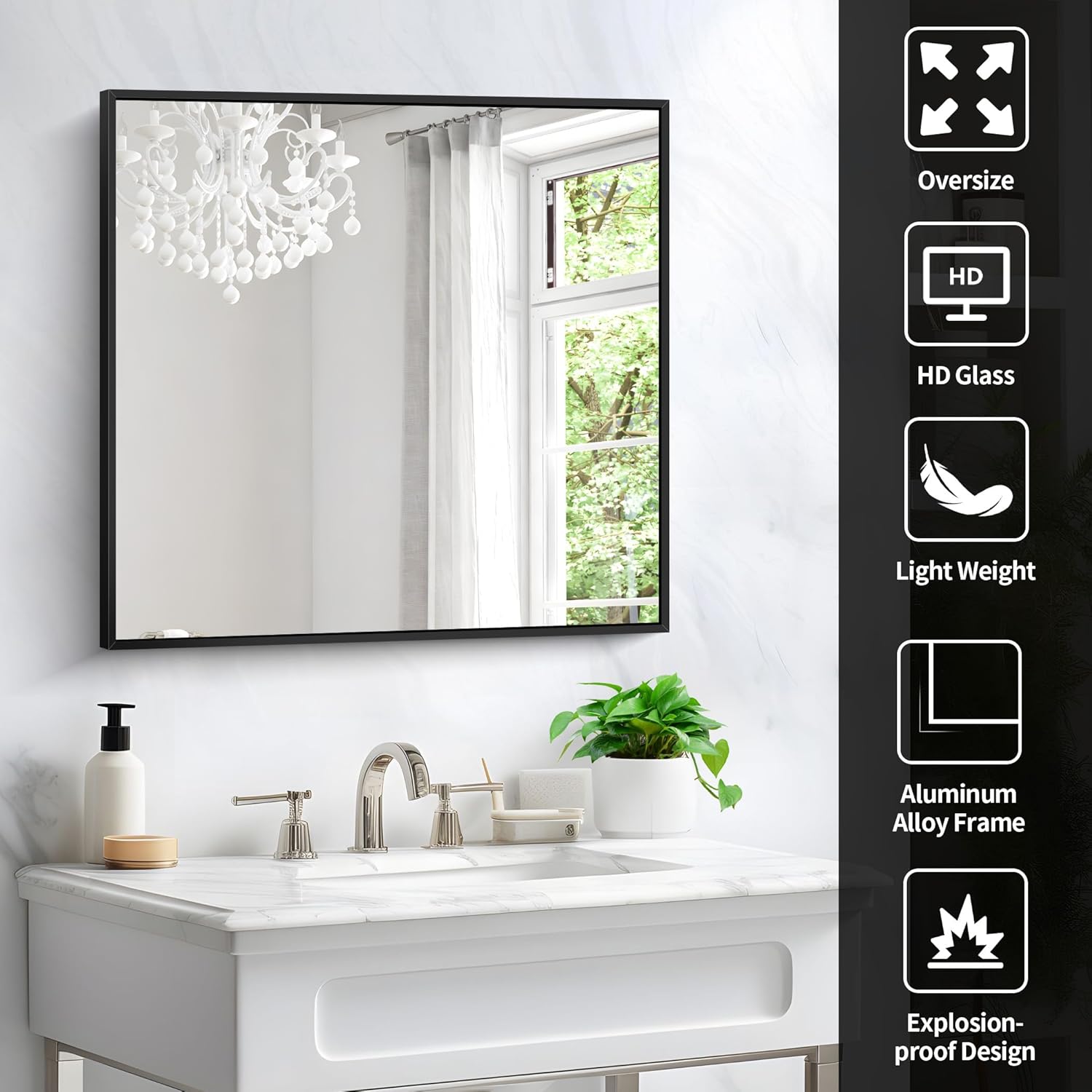 Black Bathroom Mirror for Wall, 30x30 Inch Rectangle Mirrors with Metal Frame, Modern Vanity Wall Square Mirror for Bathroom Living Room, Entryway Hangs Horizontal or Vertical