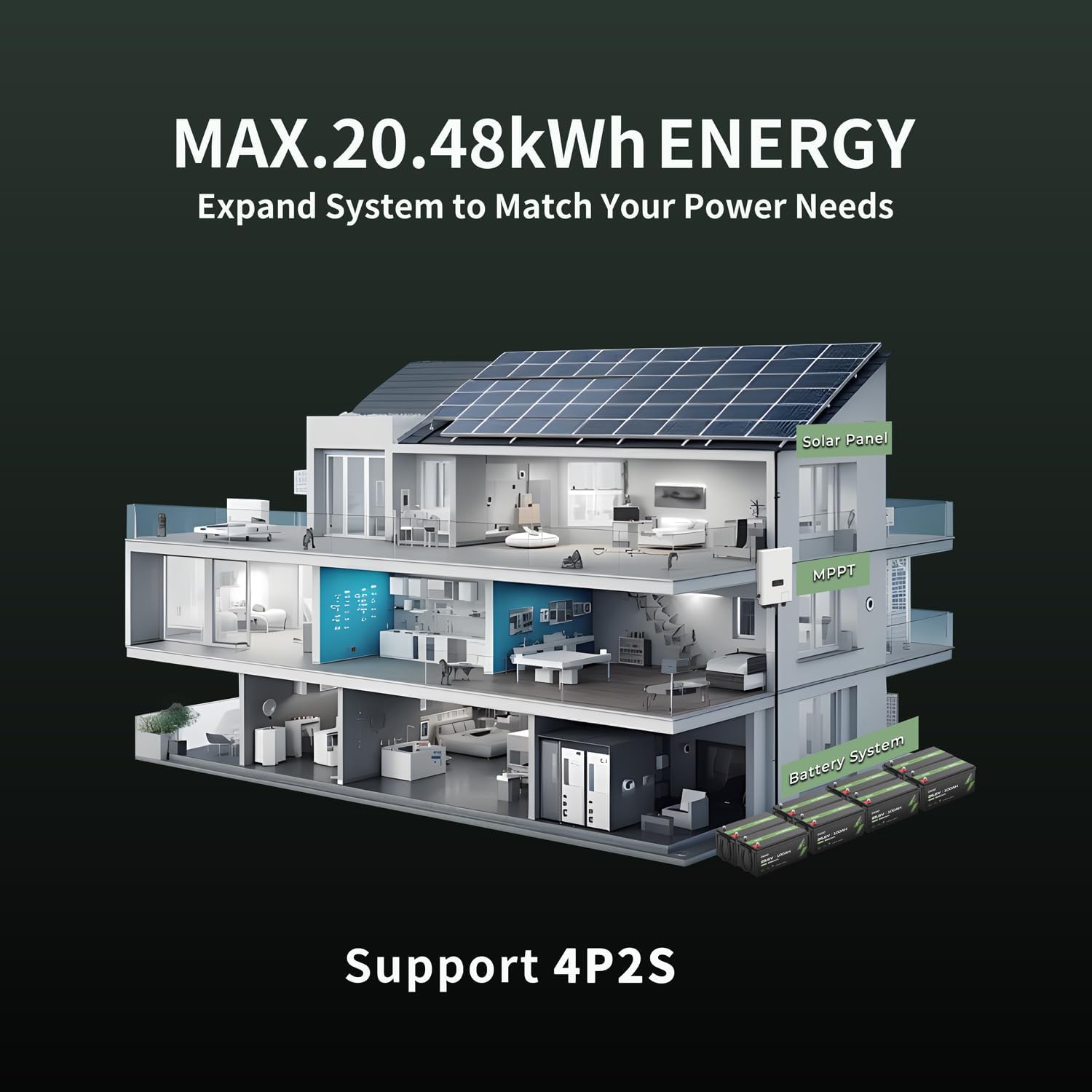 - 【Max 20.48kWh Solar Home System】 OKOM 24V lithium batteries can be expanded to a maximum 4P2S configuration (8 batteries, where S indicates series and P indicates parallel), forming a 51.2V 400Ah LiFePO4 battery system. This configuration achieves a maximum energy capacity of 20.48kWh. OKMO batteries are known for their durability and long lifespan, making them an excellent choice for solar home systems that require higher power output or extended battery runtime.