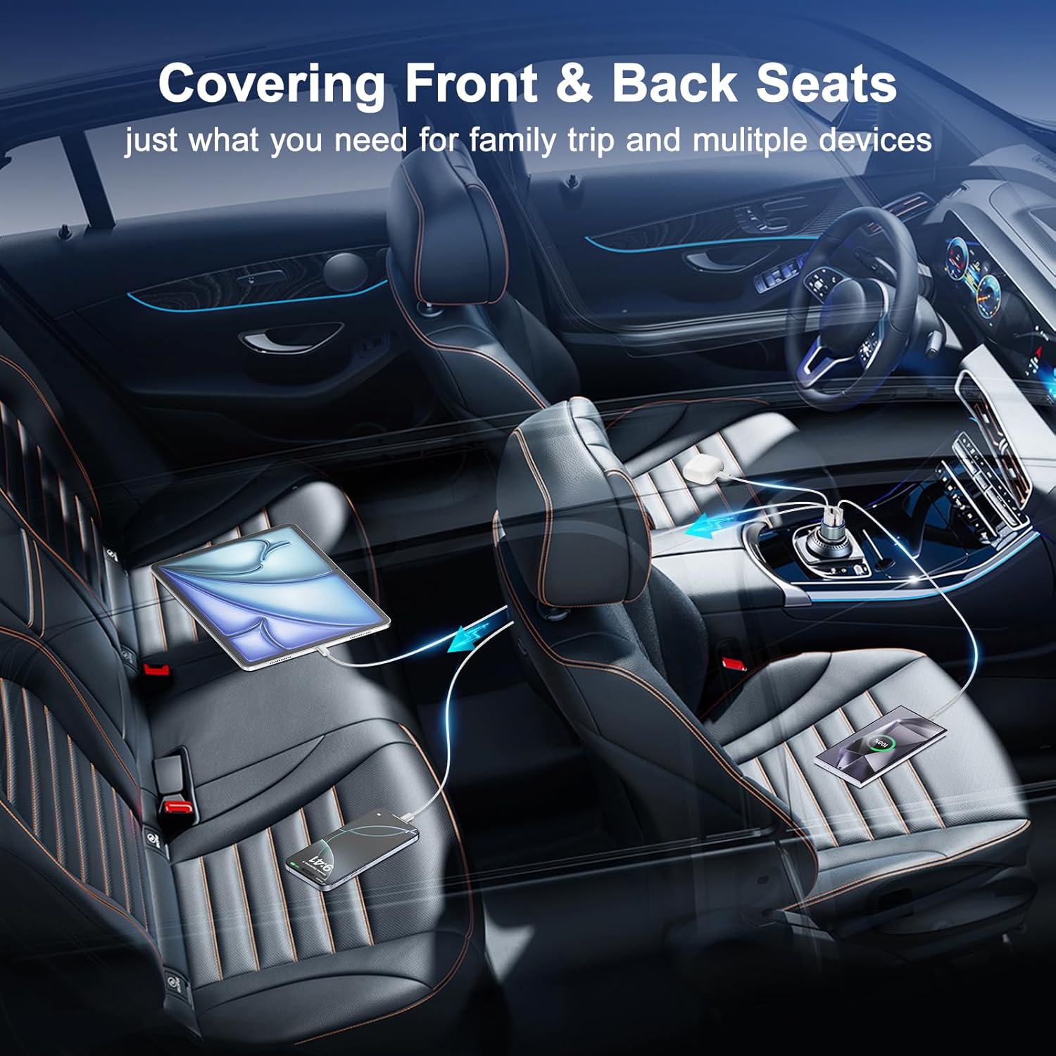 - 65W 4-Port Car Charger: Besgoods’USB C car charger delivery 65W power via 2xUSB-C ports and 2xUSB-A ports, could charge 4 devices simultaneously. It’s convenient to charge phones and other car accessories (dash cam, wireless car charger mount, usb fan etc.) in daily life or family road trip, covering front and back seats passengers.