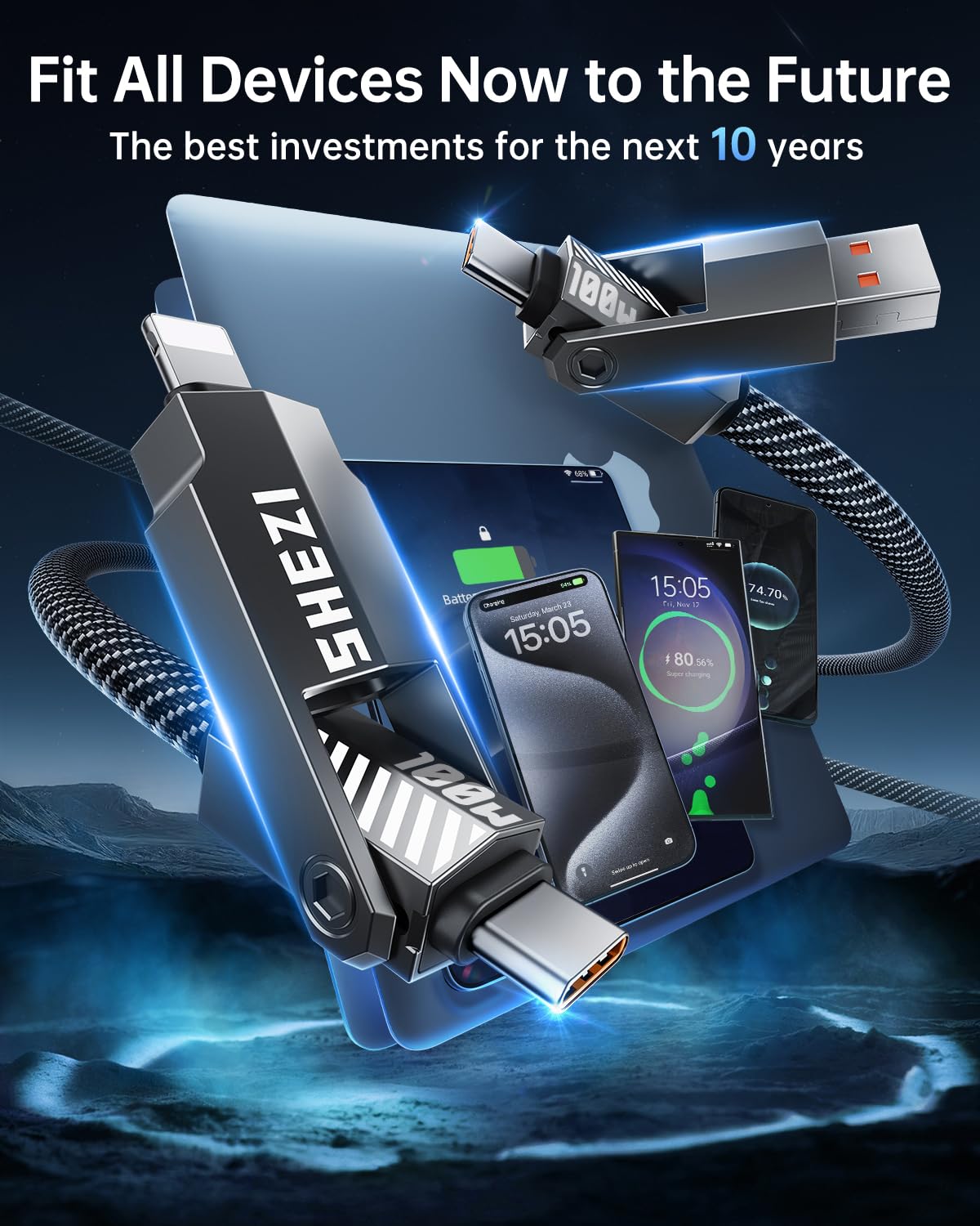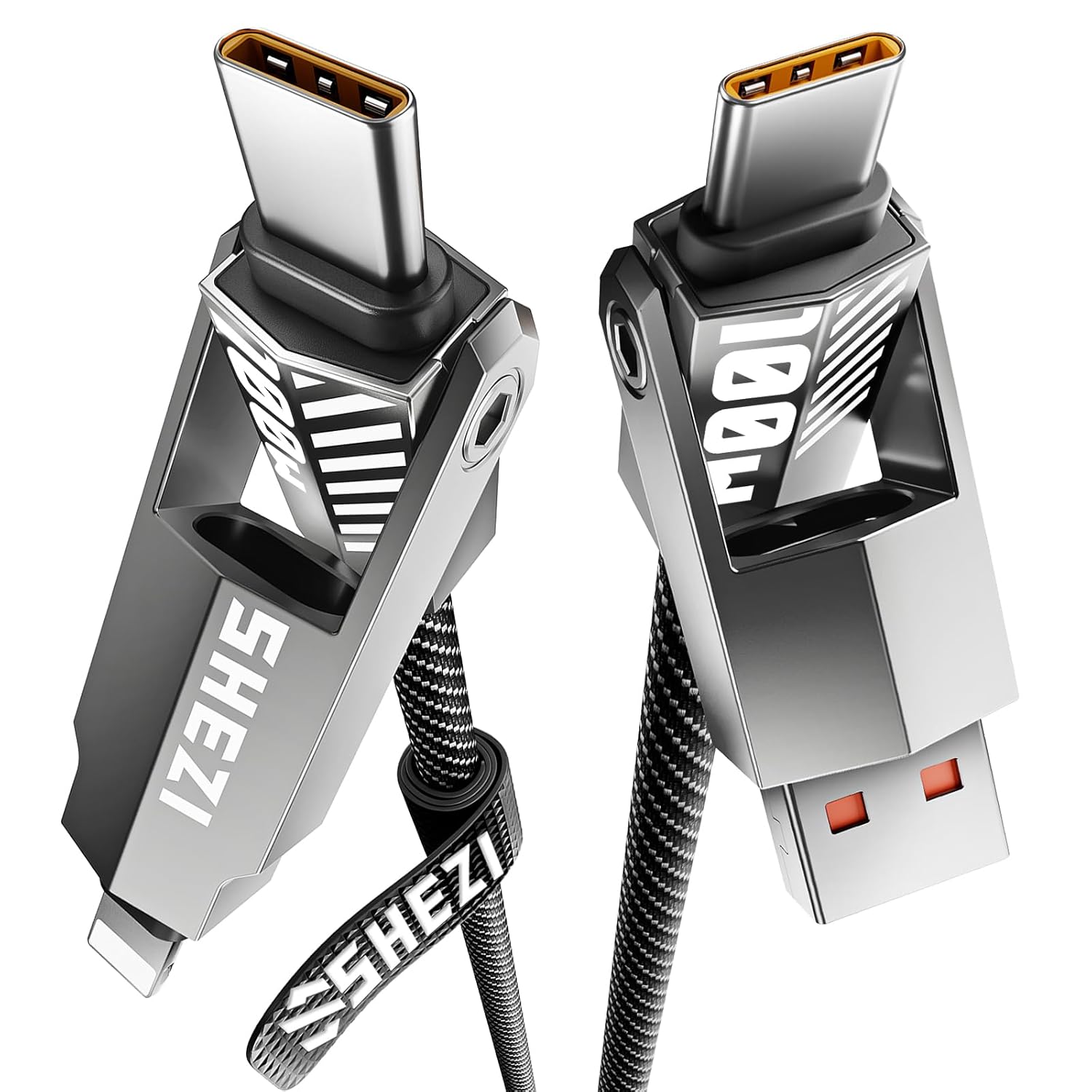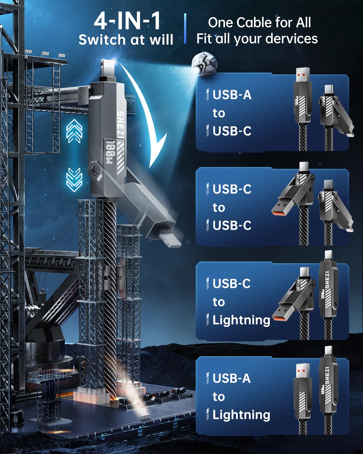 - Versatile 4-in-1 Design: SHEZI upgraded 4-in-1 multi charging cable adopts a rocket shape design of multiple ports, which meets your variety of charging needs in one cable.Charge and sync your devices without the hassle of switching between multiple cables. Simplify your charging setup with our versatile 4-in-1 usb-c cable.