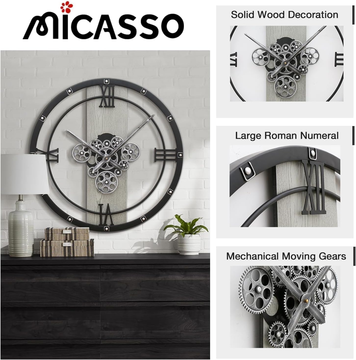 - 【Artisan Craftsmanship】Expertly constructed in three distinct layers, this clock features a solid wood outer frame with large, classic Roman numerals, the center with industrial-style moving gears and hands, and flawless finishing throughout. Each component is meticulously crafted with smooth, burr-free edges, ensuring durability at the same time.