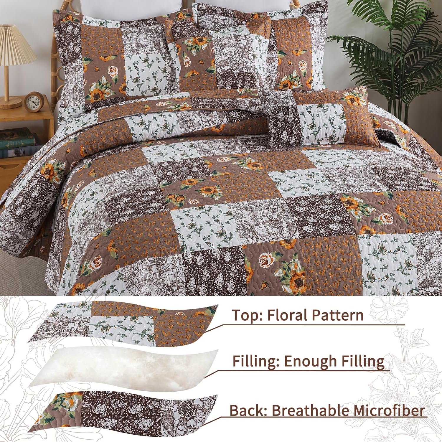 - 【Easy to Care】Brown queen bedspreads are machine-washable. No color fading and no unraveling after washing. Full size quilt can be washed by a gentle water cycle and tumbled dry at low heat. Do not bleach. When received floral quilt, it is vacuum packed, washing will make it softer and fluffier.