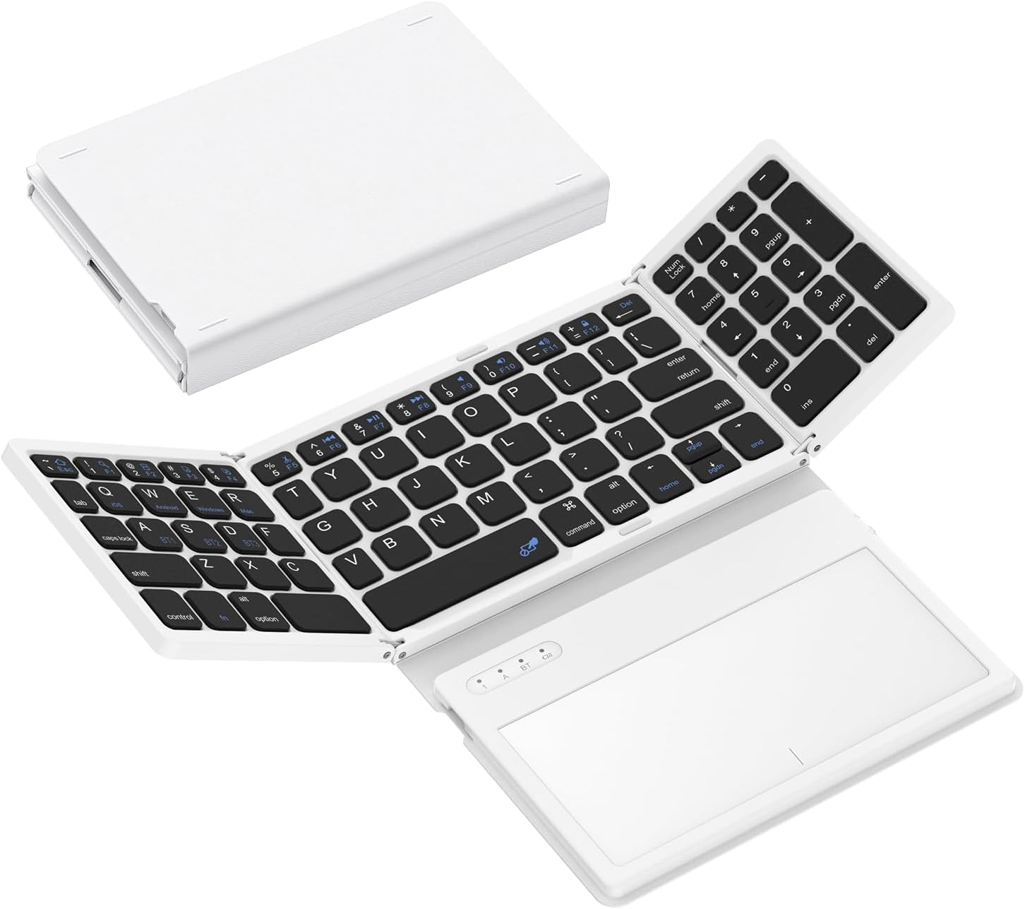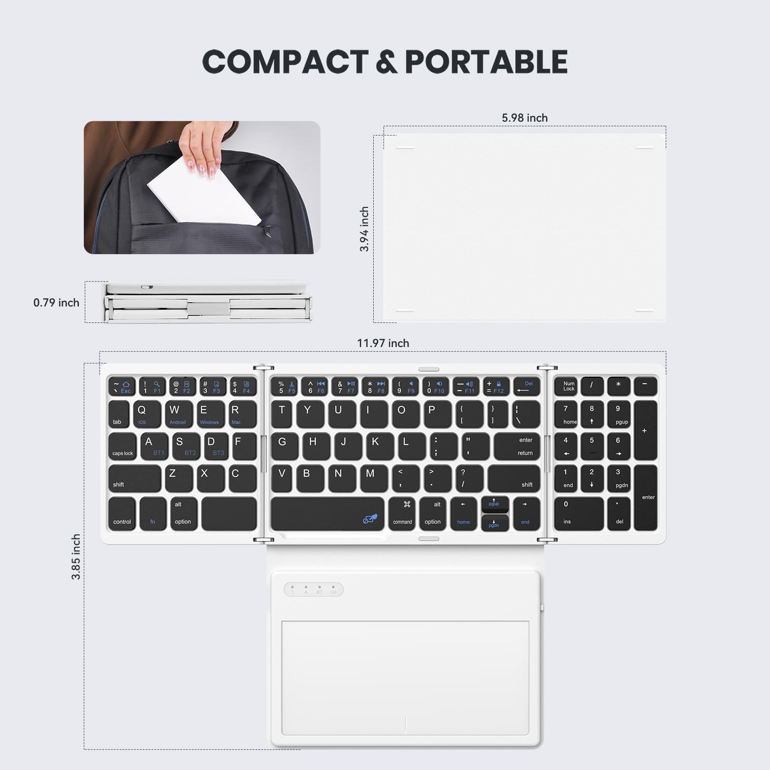 - 【Triple-Folding Portable Bluetooth Keyboard】Fold it in slide into your work bag or simply stash in your carry-on for business trips. Wherever work takes you, enjoy familiar desktop-style typing on bluetooth keyboard with number pad and a touchpad surface 20% larger than previous models. Navigate screens and multitask efficiently without packing a separate mouse