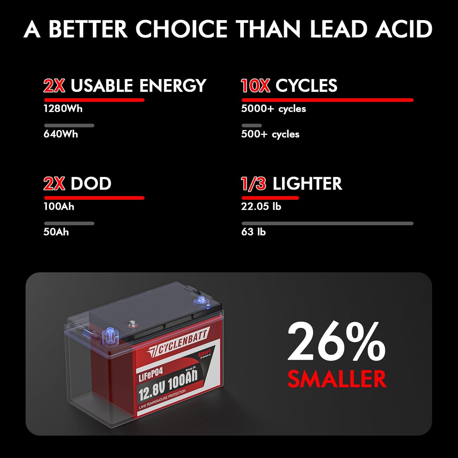 - 【Perfect Replacement for Lead-Acid Batteries in Group 24 Size】The 12-volt lithium battery is built to the BCI Group 24 standard size, weighing 22.05 LB. It is a perfect replacement for your RV or boat's lead-acid battery. This significantly reduces weight while the 100Ah lifepo4 battery provides up to twice the runtime of a lead-acid battery.