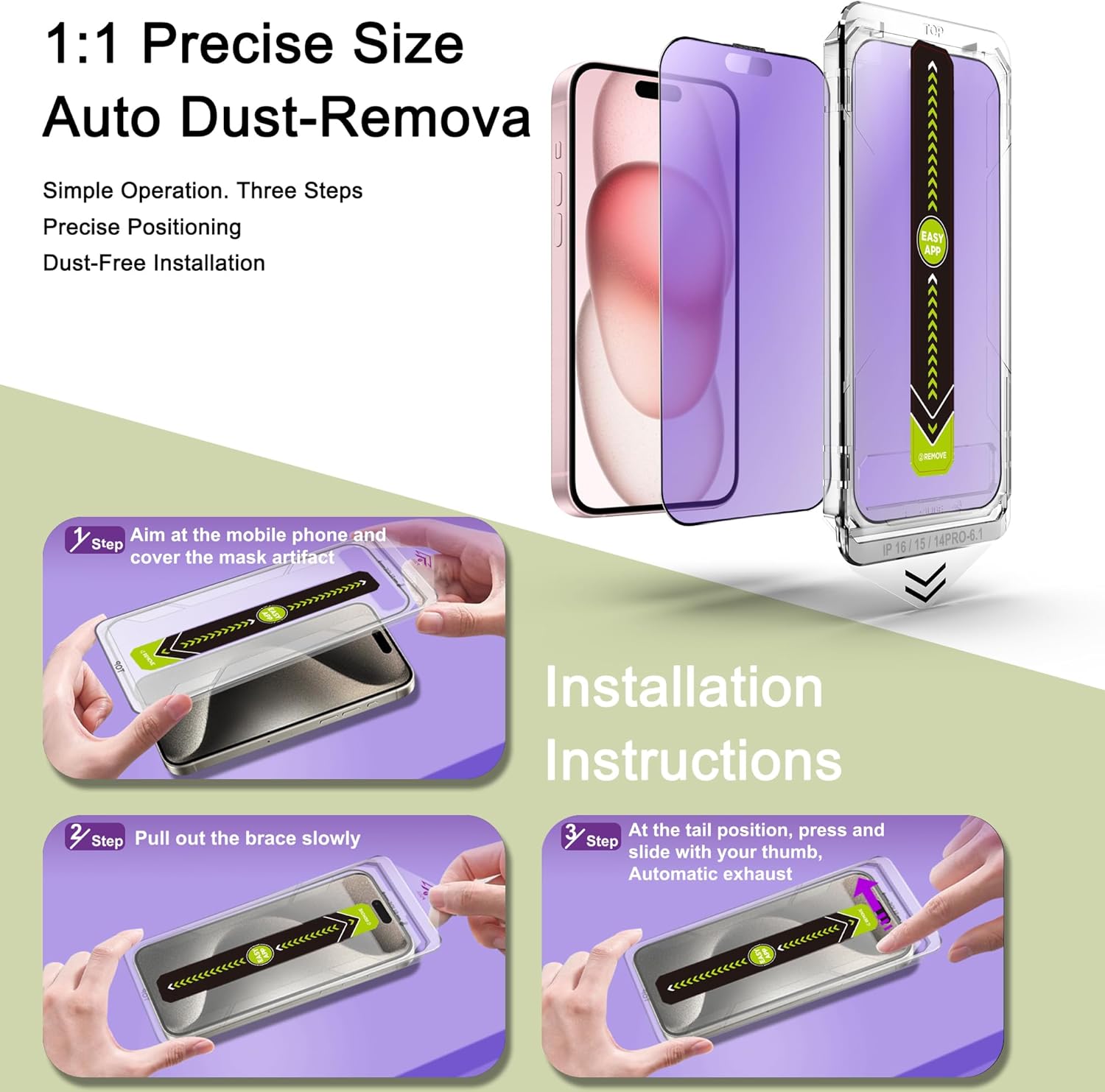 - Auto Dust Removal & Easy Installation: The SY SHANGYAN Anti Blue Light Matte Screen Protector for iPhone 14 Pro/15/16 features advanced auto dust removal and self-aligning technology for a flawless,bubble-free install every time.Just place the frame,pull the tab,and press to push out any air bubbles.Installation is quick,easy,and hassle-free.For best results,watch our step-by-step installation video before applying