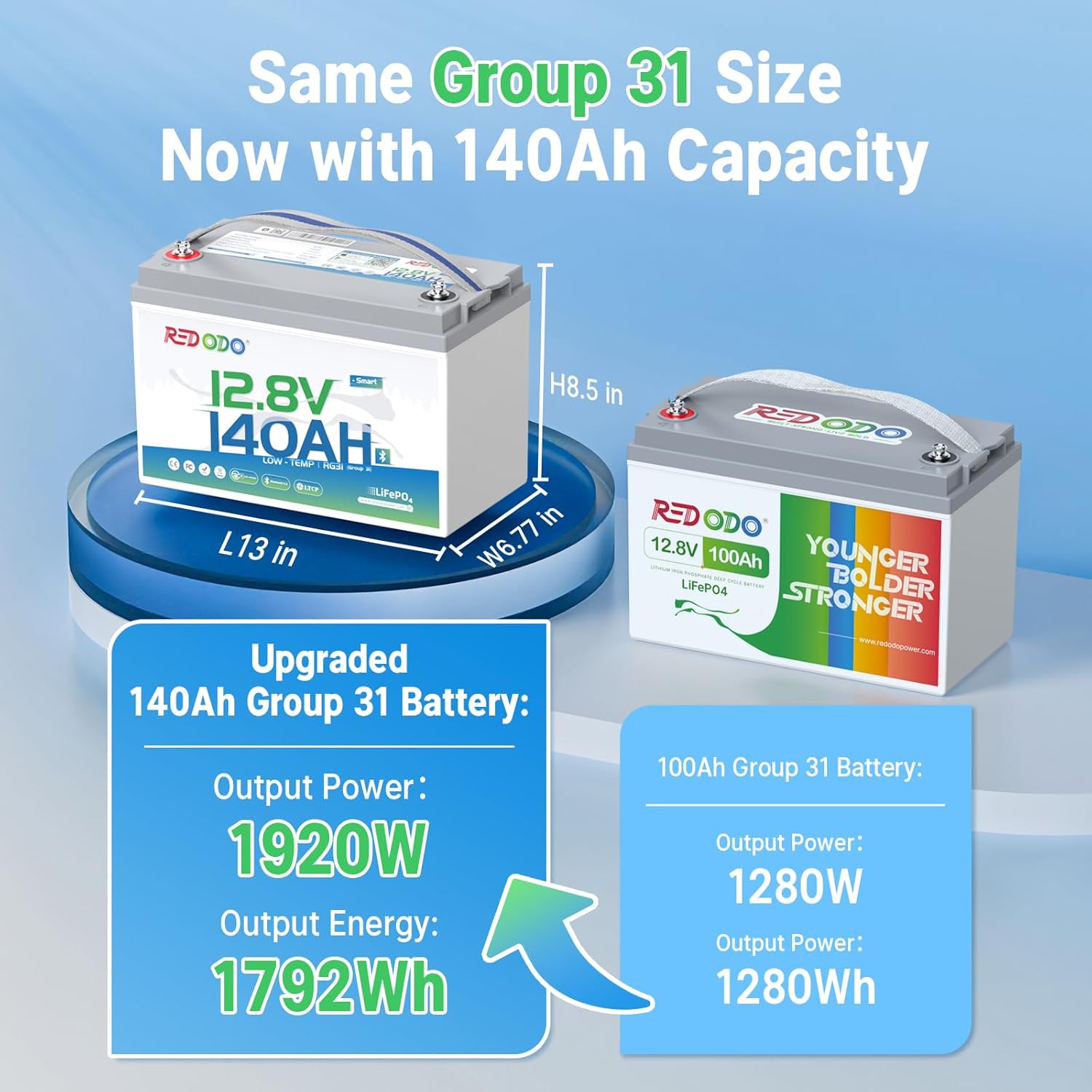 - 28.6% HIGHER CAPACITY, SAME SIZE: Upgraded from 100Ah to 140Ah Group31 lithium battery, delivering more power in the same compact design. Perfect for RVs, boats, and solar systems.