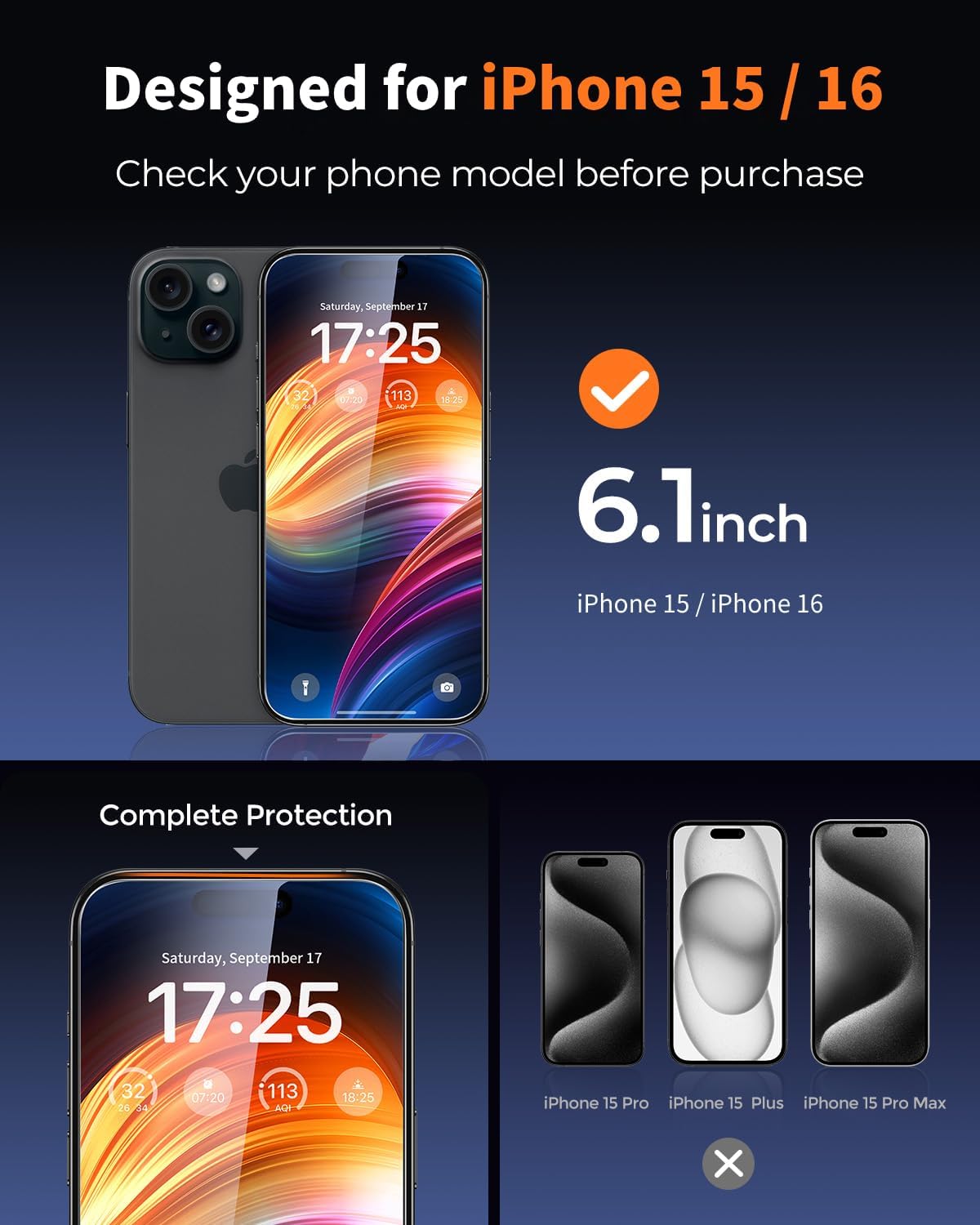 - 【Anti-Fingerprint & Shatterproof Scratch Resistant 】: The UNBREAKcable screen protector for iPhone 15/16 is coated with a Hydrophobic and oleophobic clear layer making it anti-fingerprint and smudges. With 9H hardness tempered glass, protecting your iPhone 15/16 screen from accidental scratches, falls, and bumps.
