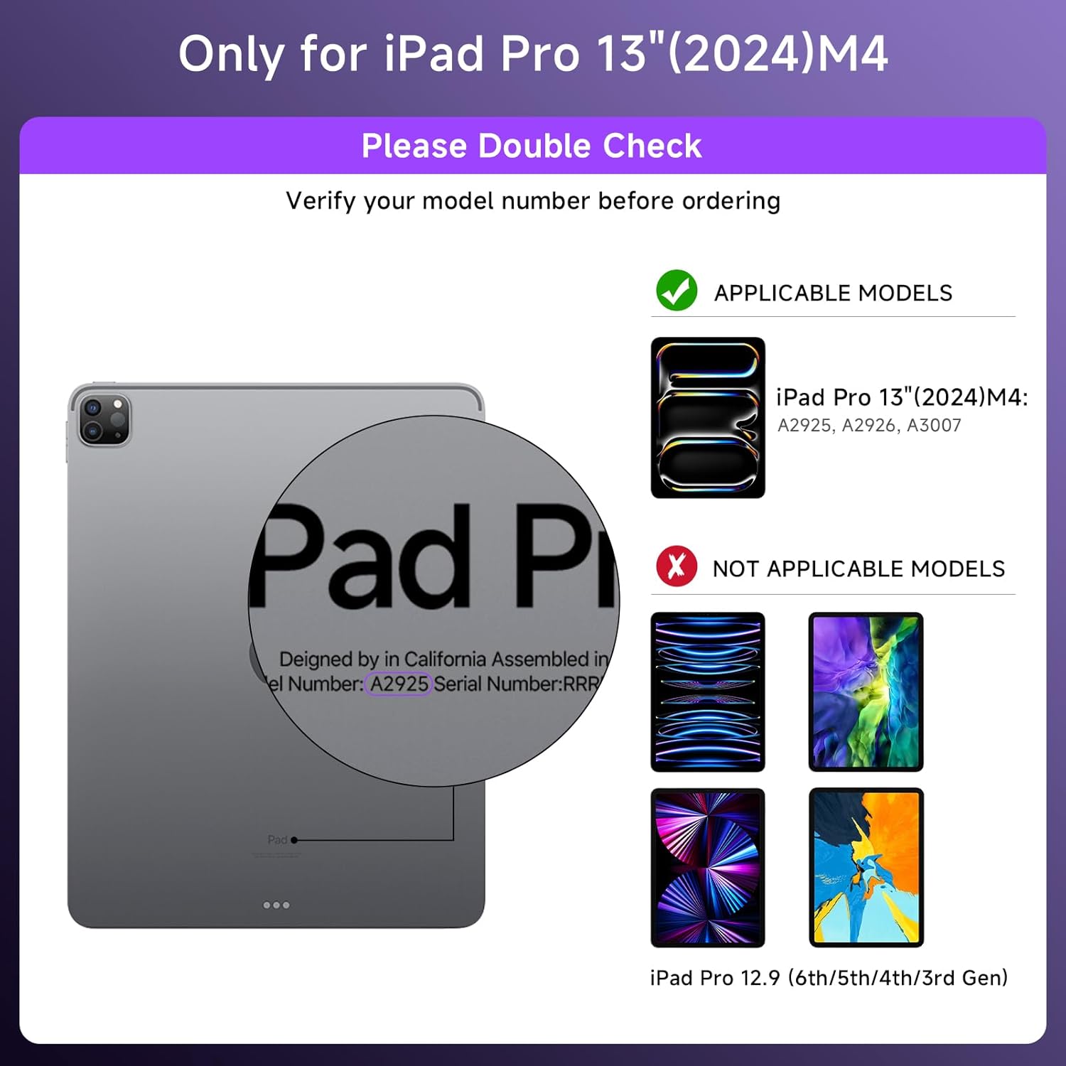 - Compatibility: only for iPad Pro 13 inch (2024, M4); Model:A2925,A2926,Please check your iPad model number on the back of your device (starting with "A") before purchasing to ensure compatibility.