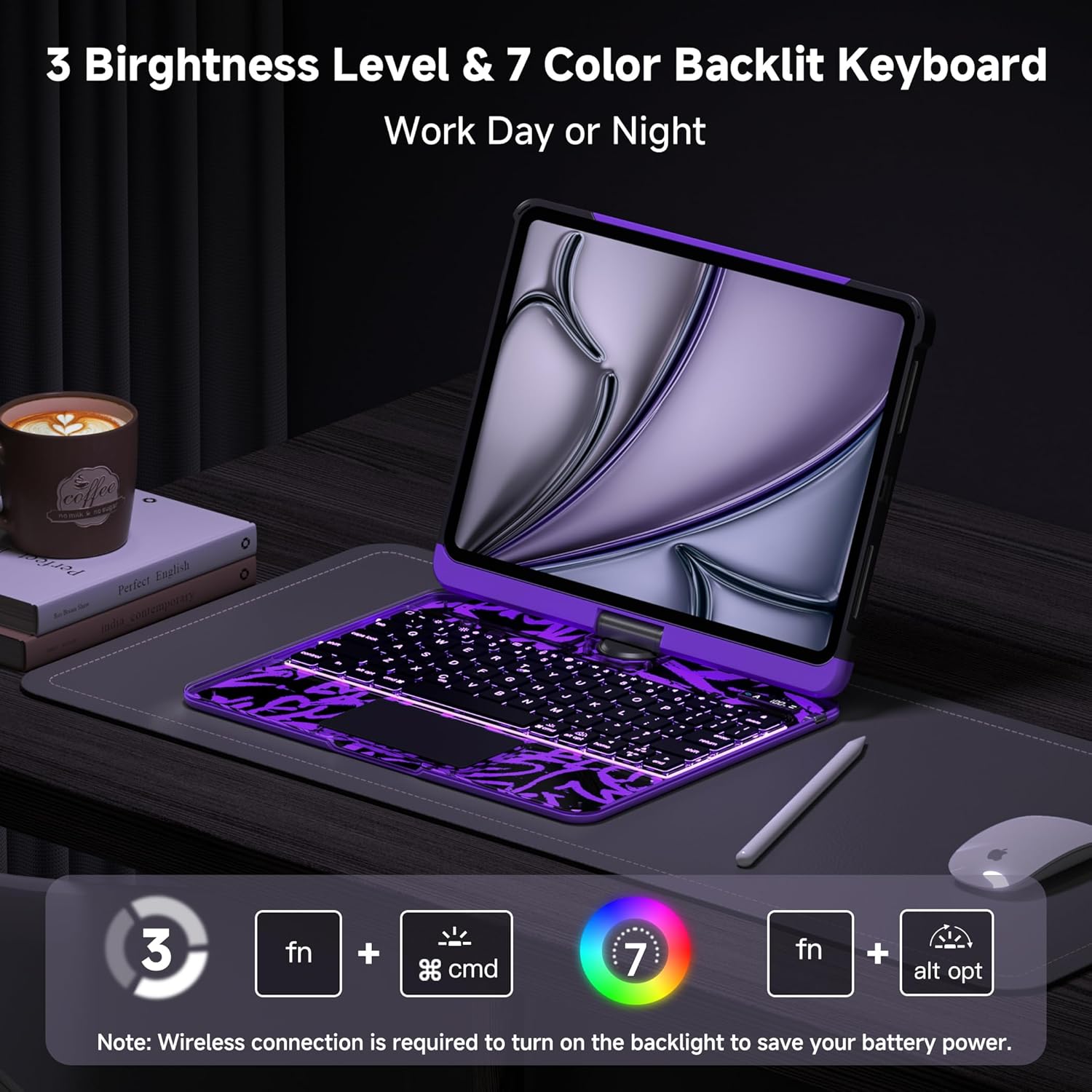 - 7-Color Backlighting: The 10.2 inch ipad case with keyboard has built-in seven-color lighting under the keyboard, three brightness adjustments so that you can clearly see every key text day and night. Close/open the tablet, the keyboard and tablet will automatically sleep/open.