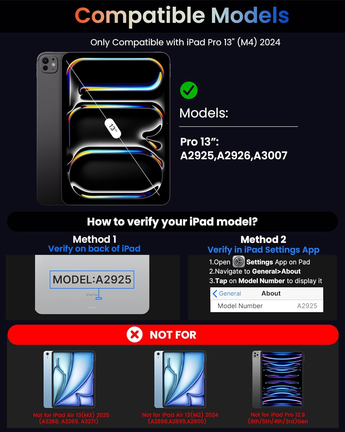 - ๐๐ผ๐บ๐ฝ๐ฎ๐๐ถ๐ฏ๐ถ๐น๐ถ๐๐:Elevate your iPad Pro 13 inch (M4) 2024 experience with our versatile keyboard case. Models include A2925,A2926,A3007. Due to the different arrangement of the magnets, this magic keyboard case is not compatible with other iPad models.If you're unsure about compatibility, feel free to reach outโwe're happy to help!
