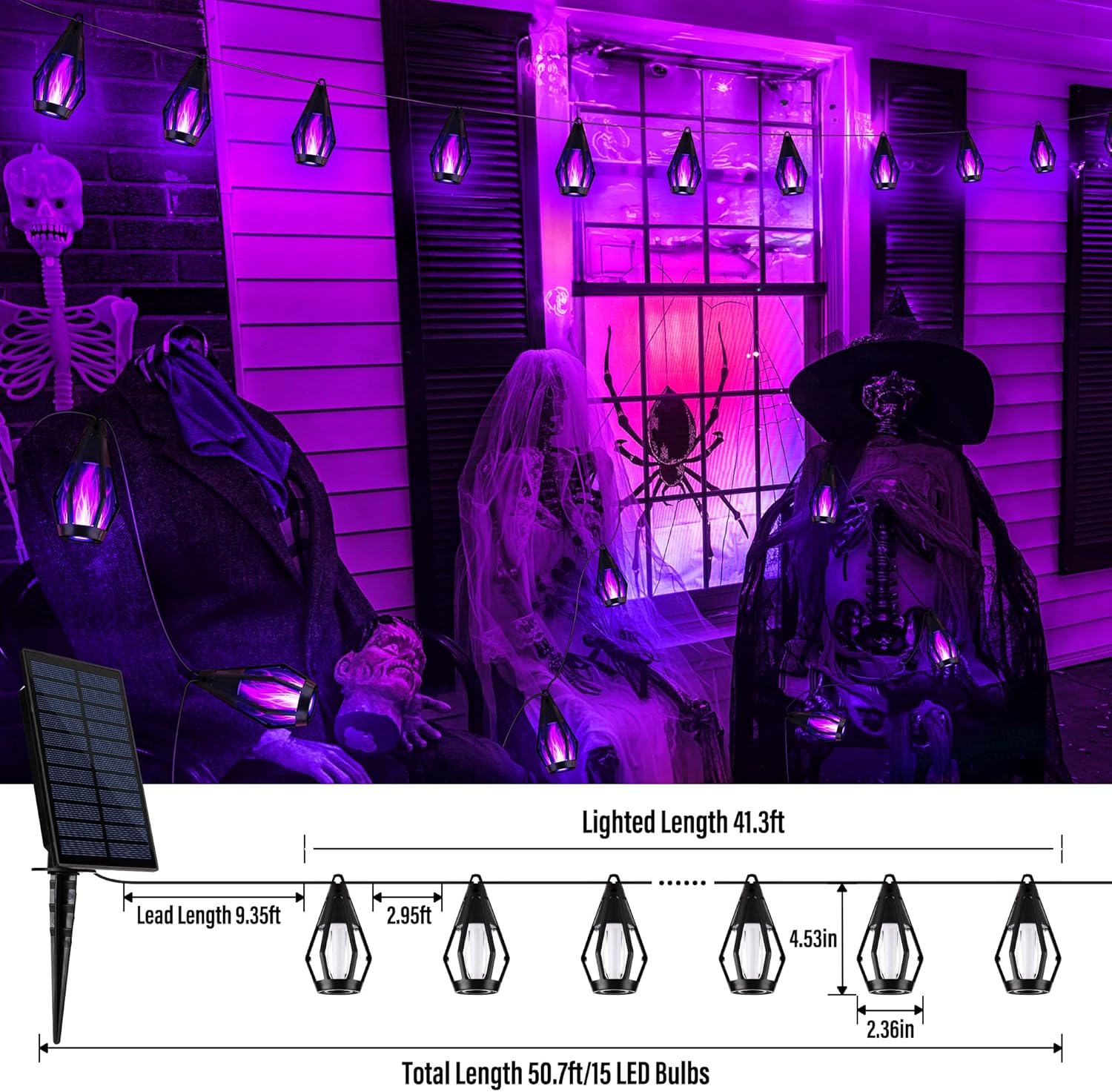 iBaycon Solar Halloween Lights, 42Ft 15 LED Bulbs Flickering Flame String Light, Outdoor Waterproof Solar Flame Lights for Garden Yard Patio Halloween Decorations (Purple)