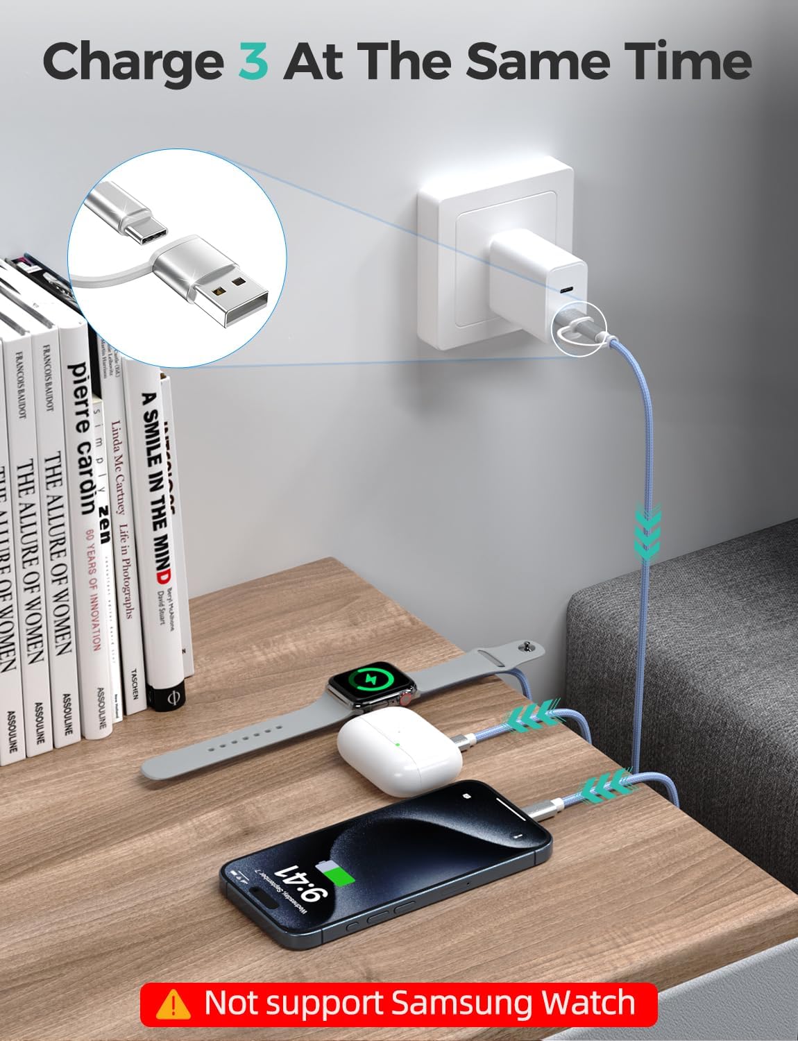 - 【3 in 2 Charging Design】There are 6 charging ways- USB C/A to Watch charger & USB C/A to cable & USB C/A to Type C Cable. The multiple charger support simultaneously charge 3 devices with a USB C/A adapter( Not included ) Compatible for all Watch ultra series 10/9/SE/8/7/6/5/4/3/2/1,the L-Port is compatible with Phone14/13/12/Pro/Max/Pad,USB C is for Phone 16/15/15 Pro/15 Plus/15 Pro Max,Samsung Galaxy S23/ S23+/ S23 Ultra/S22/ S21/ S20/ S20+