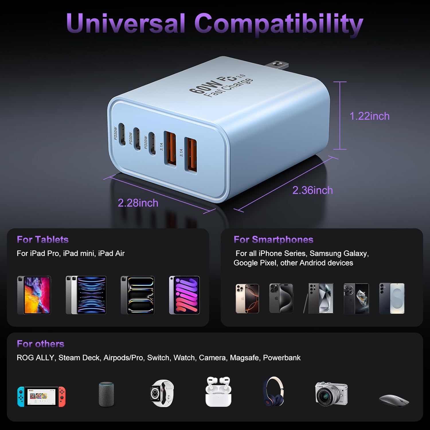 USB C Fast Wall Charger Block, 2Pack 60W USBC Charging Cubes, 5-Port PD+QC Power Adapter Multiport Brick Type C Box Plug for Phone 16/15/14/13/12/11/Pro Max/Plus, Pad Mini/Pro/S25/S24-Blue