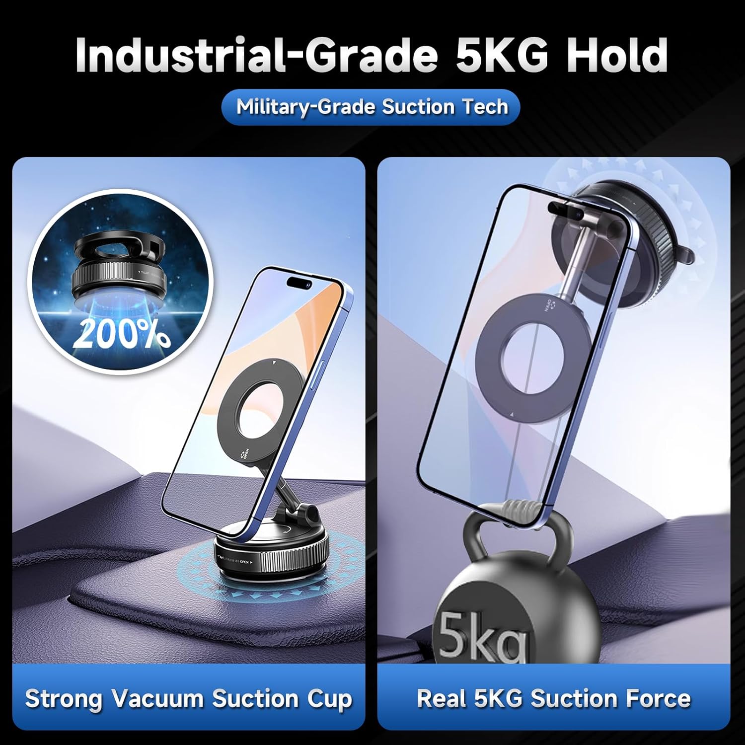 - 【UNRIVALED SUCTION & ROCK-SOLID STABILITY】 Experience the ultimate car phone holder with our 2026 upgraded vacuum magnetic suction technology. Featuring a reinforced 4-layer nano-gel base and an innovative rotary vacuum-seal, this suction cup phone mount adheres effortlessly and delivers an 80% stronger hold than traditional mounts. Twist the dial for a secure grip on your dashboard, windshield, or center console, ensuring your smartphones, including latest models, stay perfectly still, even on the bumpiest roads or during sudden brakes. This mount provides exceptional stability for your vehicle.
