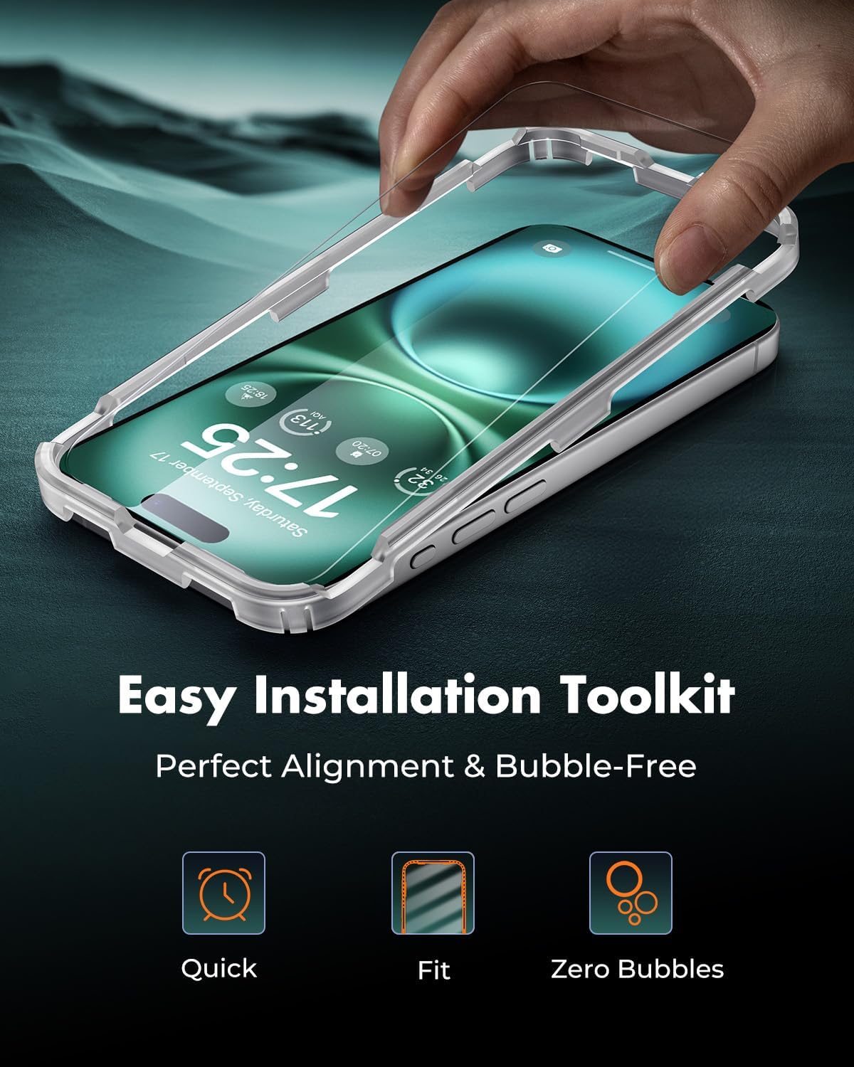- Super-Easy Installation: This screen protector kit includes an installation frame, alcohol wipes, dust removal stickers and absorbers, a microfiber cloth, and a guide. Perfect alignment is effortless, even for beginners.