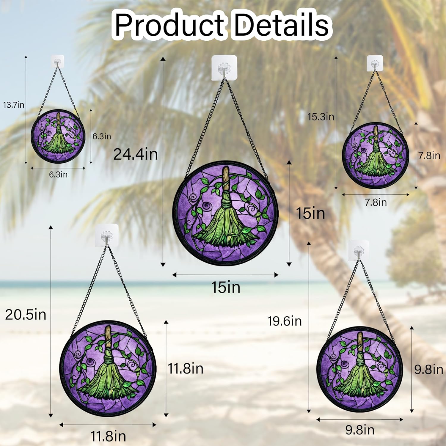 Stained Glass Window Hanging - Halloween Decorations Witch Magic Broom Suncatcher for Doors Garden Indoor Funny Spooky Sun Catchers Gothic Decor Horror Gifts for Women Men Friend 11.8 in