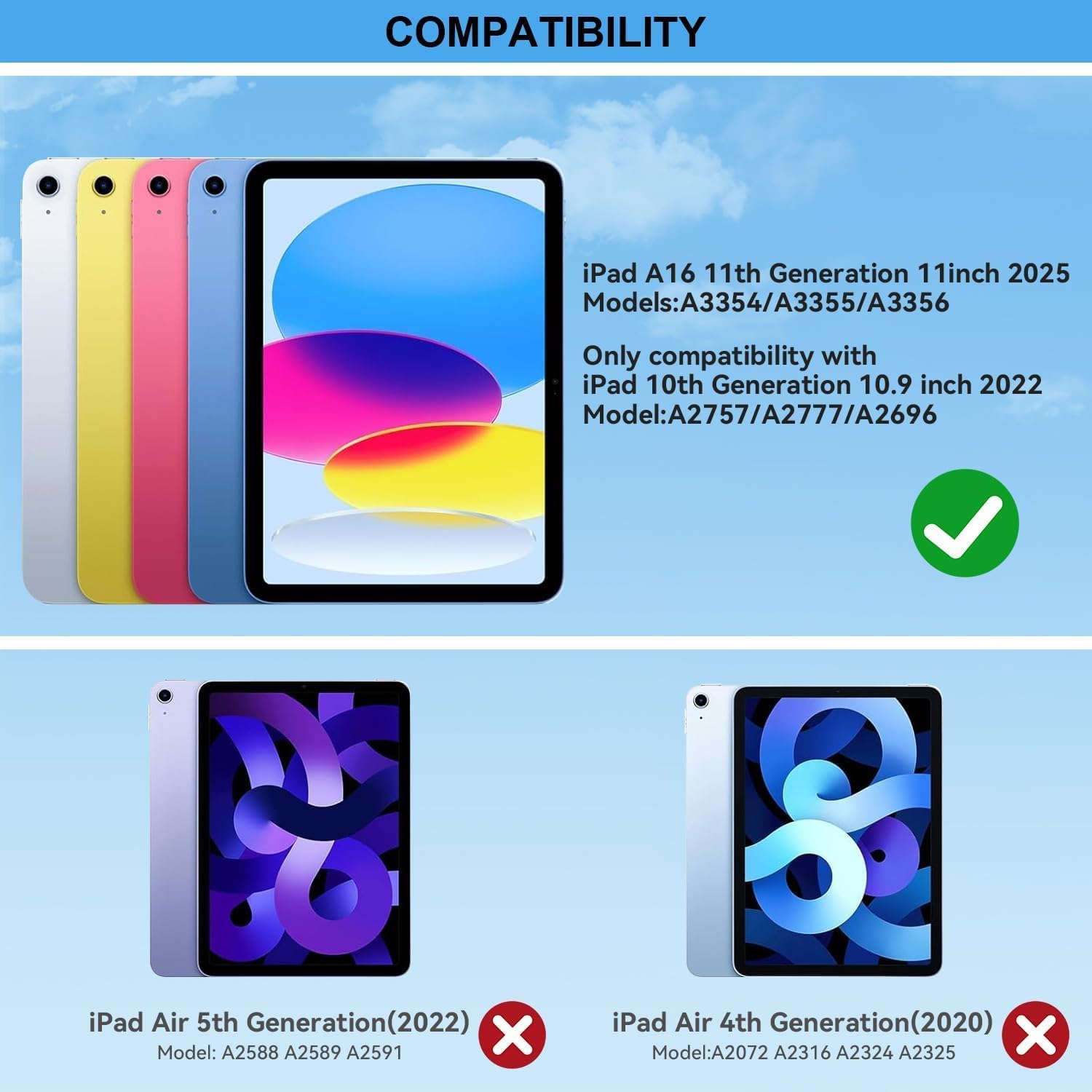 - Compatible Devices : Compatible with iPad A16 11-inch 11th Generation 2025 and 10th Generation 10.9inch 2022(Model Number:A3355/A3356/A2696/A2757/A2777) Compatible with iPad A16 11-inch 11th Generation 2025 and 10th Generation 10.9inch 2022(Model Number:A3355/A3356/A2696/A2757/A2777)