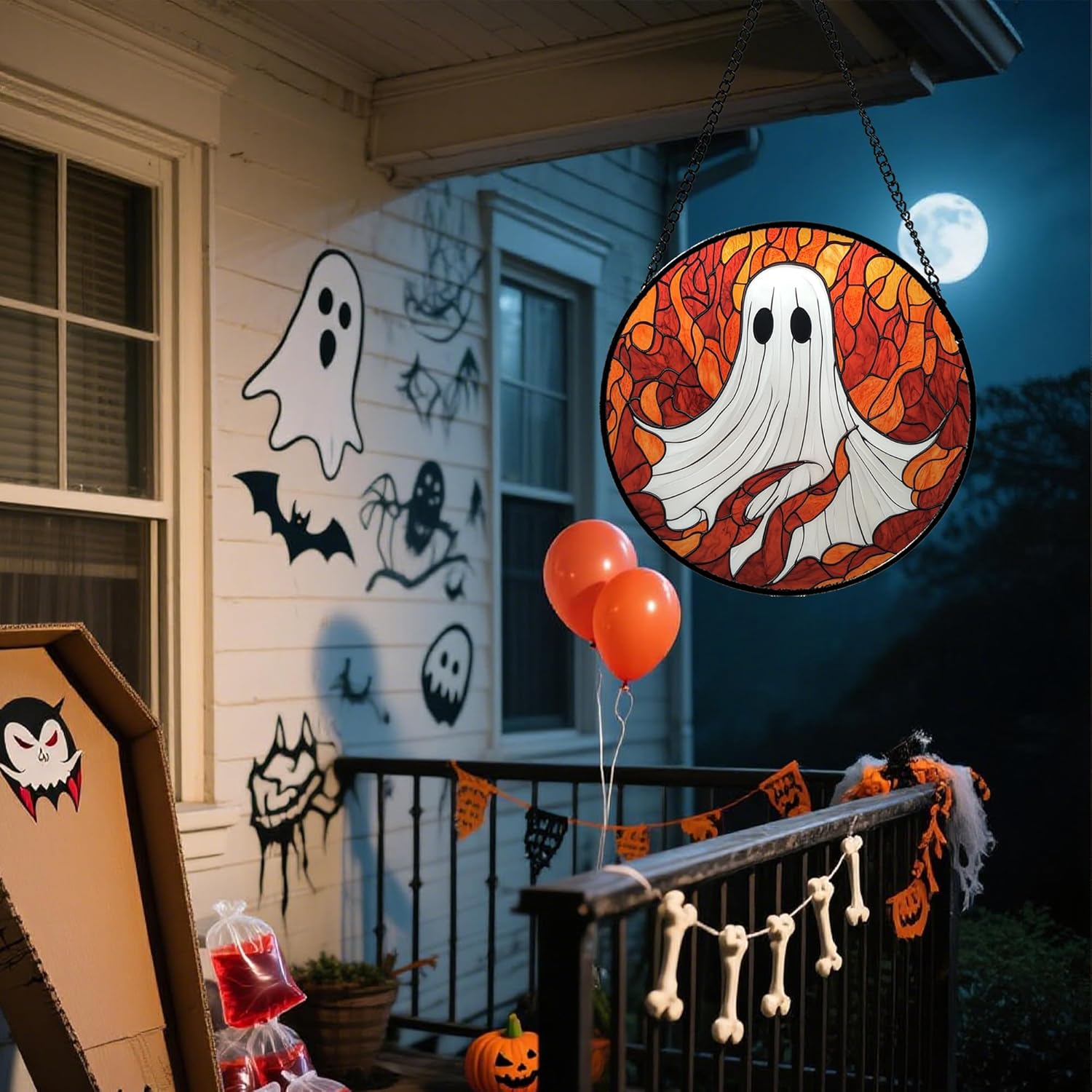 Stained Glass Window Hanging - Halloween Decorations White Ghost Orange Sky Suncatcher for Doors Garden Funny Spooky Sun Catchers Gothic Decor Horror Gifts for Women Men Friend Boy 6.3 in