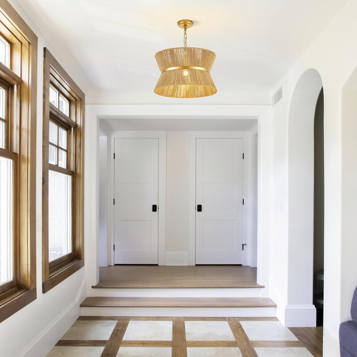 18” Hand Woven Rattan Boho Chandelier Brass Ajustable Pendant Light for Kitchen Island Living Room Bedroom Hallway, UL Listed